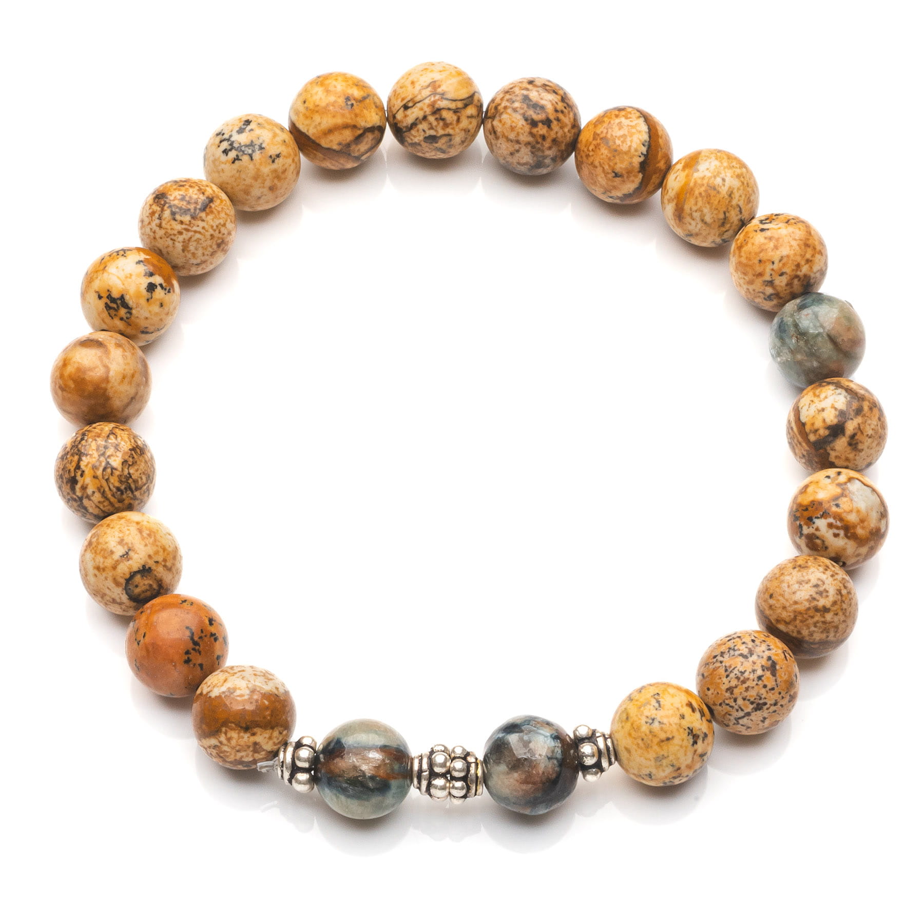 Ręcznie wykonana bransoletka męska skomponowana z naturalnego Jaspisu Krajobrazowego w połączeniu ze szlachetnym Turmalinem w wyselekcjonowanym, niebieskim kolorze oraz elementów ozdobnych z oksydowanego srebra pierwszej próby 925. Turmaliny należą do minerałów rzadkich, występują w każdym możliwym do wyobrażenia sobie kolorze, niektóre posiadają niezwykłe spękania i wtrącenia, inne wykazują efekt kociego oka; niektóre zmieniają swoją barwę lub transparentność w zależności od oświetlenia a jeszcze inne nigdy nie przybierają stałego koloru ani cech. Bez wątpienia są to jedne z najbardziej nietuzinkowych i fascynujących kamieni szlachetnych i ze względu na powyższe cechy - jedne z najchętniej wykorzystywanych do produkcji naszej biżuterii. Aby dobrać paciorki zbliżone do siebie barwą i strukturą, należy dokonać selekcji ogromnej ilości tego drogocennego kamienia. Elastyczna bransoletka z kamieni Jaspisu Krajobrazowego o średnicy 8mm tworzących wielobarwne połączenia w odcieniach beżu, brązu oraz szarości, posiada zachwycające różnorodnością rysunki natury, charakterystyczne dla tego kamienia. Biżuteria odpowiednia dla Panów lubiących klasyczną elegancję w ciepłej tonacji. Produkt został zaprojektowany i wykonany rzemieślniczo w Polsce. Opakowanie widoczne na zdjęciu wliczone jest w cenę.