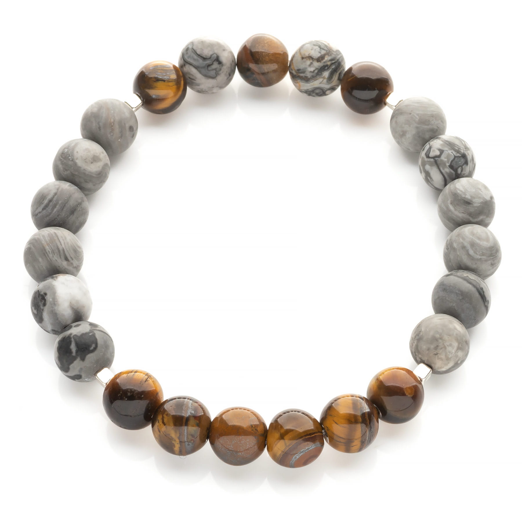 Ręcznie wykonana bransoletka męska skomponowana z naturalnego Jaspisu szarego w połączeniu z kamieniem Tygrysie Oko oraz drobnymi elementami ozdobnymi ze srebra pierwszej próby 925. Kamienie Jaspisu o średnicy 8mm tworzą wielobarwne połączenia w odcieniach beżu, brązu oraz szarości, posiadają zachwycające różnorodnością rysunki natury, charakterystyczne dla tego kamienia. Stonowany Jaspis szary, użyty w obecnym wzorze nadaje biżuterii chłodnego, męskiego charakteru a kamienie Tygrysiego oka, mieniącego się barwami złota, karmelu i różnych odcieni brązu ożywiają i ocieplają całość. Naturalne Tygrysie oko można łatwo rozpoznać po połyskujących pasmach, przypominających te na sierści dzikiego kota. Kamień zawdzięcza swoją nazwę niezwykłemu efektowi optycznemu – w blasku słońca tygrysie oko lśni i migocze, a połyskujące jasne linie przemieszczają się podczas poruszania kamieniem. Biżuteria odpowiednia dla Panów lubiących klasyczną elegancję w kontrastowej tonacji. Dobry pomysł na prezent dla bliskiej osoby, gdyż w przypadku biżuterii elastycznej nie musisz znać dokładnego rozmiaru nadgarstka. Produkt został zaprojektowany i wykonany rzemieślniczo w Polsce. Opakowanie widoczne na zdjęciu wliczone jest w cenę.