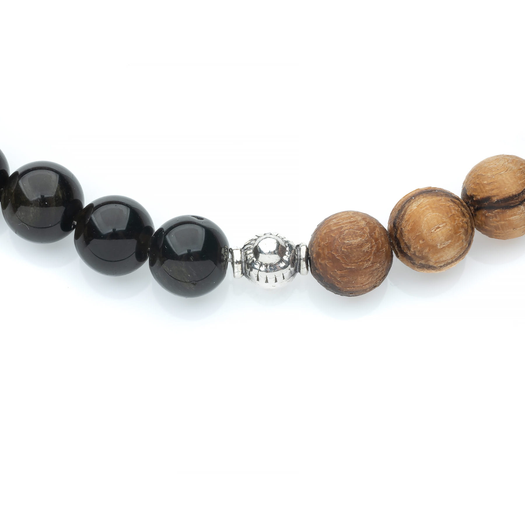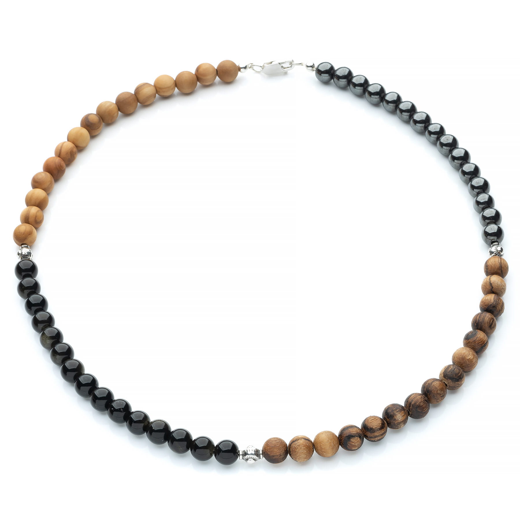 Męski naszyjnik długości 50 cm wykonany z drewna egzotycznego Zebrano i Sandałowca złocistego oraz kamieni naturalnych- Obsydianu złocistego i Hematytu. Drewno Zebrano posiada barwę jasnobrązową i charakterystyczne żyłkowanie w kolorze szaro-brązowym lub brązowo-czarnym, w zależności od wieku ściętego drzewa. Ze względu na ciekawy rysunek jest surowcem coraz chętniej stosowanym w wyrobach biżuteryjnych, pomimo trudności z jego obróbką. Paciorki egzotycznego Sandałowca o złocistożółtym kolorze posiadają charakterystyczne cętkowo-liniowe usłojenie. Niespotykana barwa w połączeniu z dużą trwałością sprawia, że jest to idealny surowiec do tworzenia biżuterii męskiej. Hematyt w naturze przybiera kolor czarny i bardzo ciemno-brunatny, jednak po sproszkowaniu okazuje się być krwisto czerwony. Z tego powodu również w Polsce kamień ten nazywany jest „krwawnikiem”. Paciorki o średnicy 8 mm, które po wypolerowaniu nabrały metalicznego blasku z tęczowymi poświatami, dla ludzkiego oka zdają się być w kolorze grafitowym. W rzeczywistości są jednak czarne. I wreszcie Obsydian Złocisty, który jest jedynym występującym w przyrodzie naturalnym szkłem, zbudowanym w całości ze szkliwa wulkanicznego. Szlifowane, okrągłe kamienie na pierwszy rzut oka są czarne, ale w słońcu uwidaczniają się przepiękne złoto-karmelowe smugi, które tworzą metaliczny odblask powstający za sprawą pęcherzyków powietrza. Nadaje to wyjątkowego, trójwymiarowego efektu. Naszyjnik wykonano przy użyciu trwałej linki jubilerskiej i wykończono elementami ozdobnymi ze srebra oksydowanego pierwszej próby 925. Produkt wykonano ręcznie w Polsce, opakowanie widoczne na zdjęciu wliczone jest w cenę.