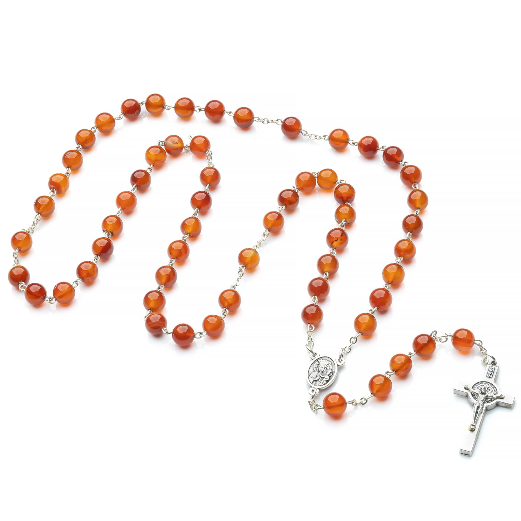 Różaniec wykonany z Agatu karneolowego, którego barwa zawsze nieco się różni ze względu na niezwykłe bogactwo odcieni tego kamienia. Paciorki o średnicy 8mm w kolorze miodowo-czerwonym z przebarwieniami o różnym nasyceniu wyglądem bardzo przypominają bursztyn. Długość różańca ok 52 cm. Metalowe elementy najwyższej jakości wykonane we Włoszech, krzyż św. Benedykta i łącznik Jan Paweł II/M.B. Częstochowska. Różaniec z naturalnego Agatu w uniwersalnym odcieniu stanowi praktyczny i piękny upominek religijny dla każdego. Produkt wykonany ręcznie w Polsce.