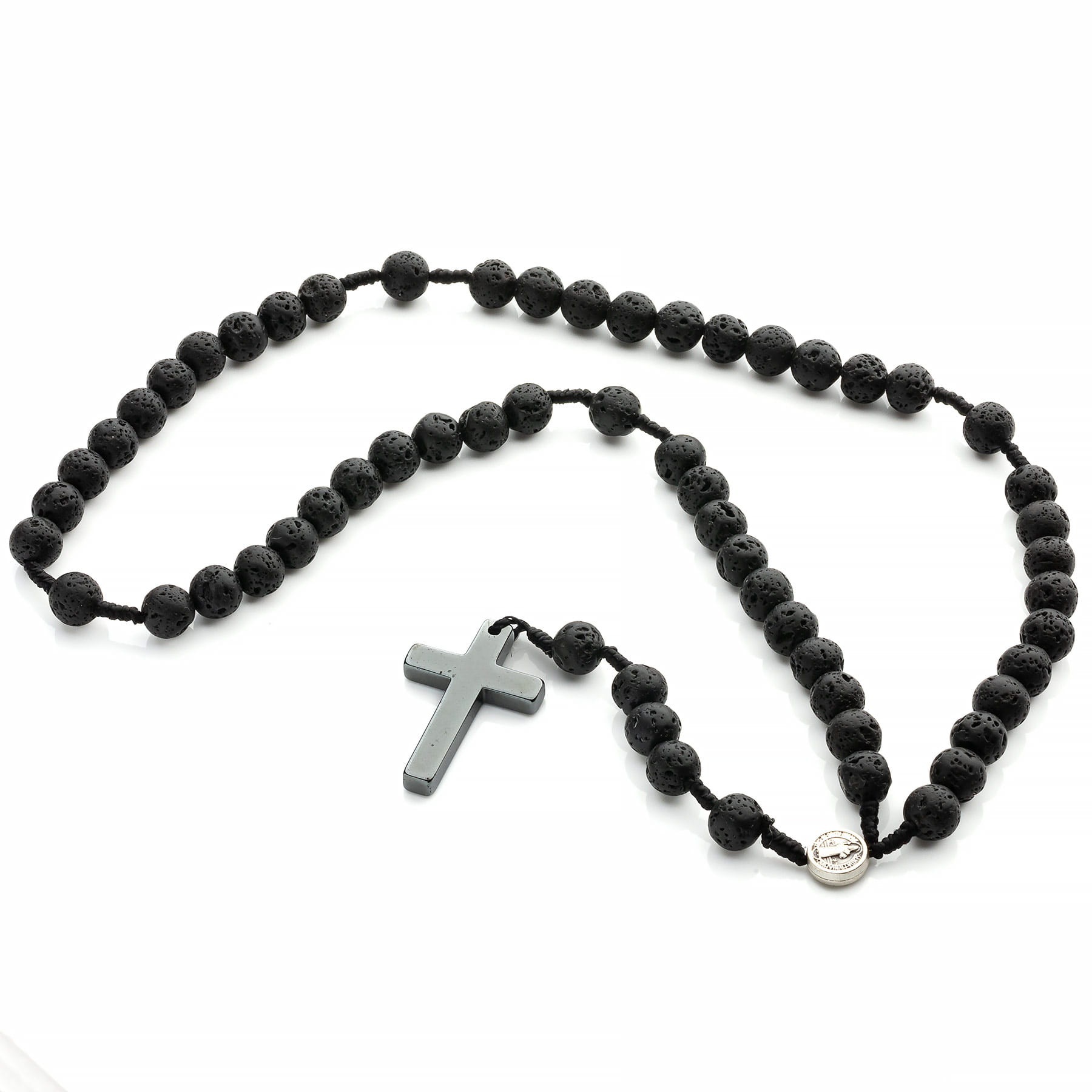 Nowoczesny różaniec w czarnym kolorze, którego bazą jest sznurek makramowy oraz matowe kamienie naturalne lawy wulkanicznej. Lawa o nieregularnej strukturze posiada liczne wgłębienia co jest jej charakterystyczną cechą ukształtowaną przez naturę. Wielkość paciorka 8mm, długość różańca ok 52 cm. Różaniec wykończony dużym krzyżykiem z Hematytu. Hematyt w naturze przybiera kolor czarny i bardzo ciemno-brunatny, jednak po sproszkowaniu okazuje się być krwisto czerwony. Z tego powodu również w polsce kamień ten nazywany jest „krwawnikiem”. Po wypolerowaniu nabiera metalicznego blasku z tęczowymi poświatami, dla ludzkiego oka zdaje się być w kolorze grafitowym. W rzeczywistości jest jednak czarny. Produkt wykonany ręcznie w Polsce. Stanowi praktyczny i nowoczesny upominek religijny zarówno dla kobiet jak i mężczyzn. Opakowanie widoczne na zdjęciu wliczone jest w cenę.