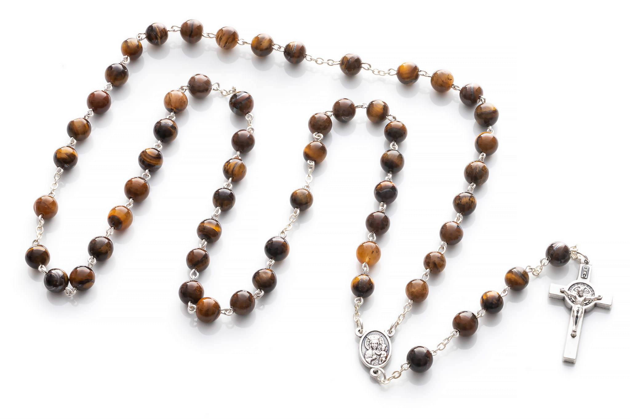 Różaniec w jesiennych kolorach wykonany z wyjątkowej urody kamienia tygrysie oko, mieniącego się barwami złota, karmelu i różnych odcieni brązu. Naturalne tygrysie oko można łatwo rozpoznać po połyskujących pasmach, przypominających te na sierści dzikiego kota. Kamień zawdzięcza swoją nazwę niezwykłemu efektowi optycznemu – w blasku słońca tygrysie oko lśni i migocze, a połyskujące jasne pasmo przemieszcza się podczas poruszania kamieniem. Wielkość paciorka 8mm, długość różańca ok 52 cm, metalowe elementy najwyższej jakości wykonane we Włoszech, Krzyż św. Benedykta i łącznik Jan Paweł II/M.B. Częstochowska . Produkt wykonany ręcznie w Polsce. Stanowi wyjątkowy i praktyczny upominek religijny zarówno dla kobiet jak i mężczyzn. Opakowanie widoczne na zdjęciu wliczone jest w cenę.