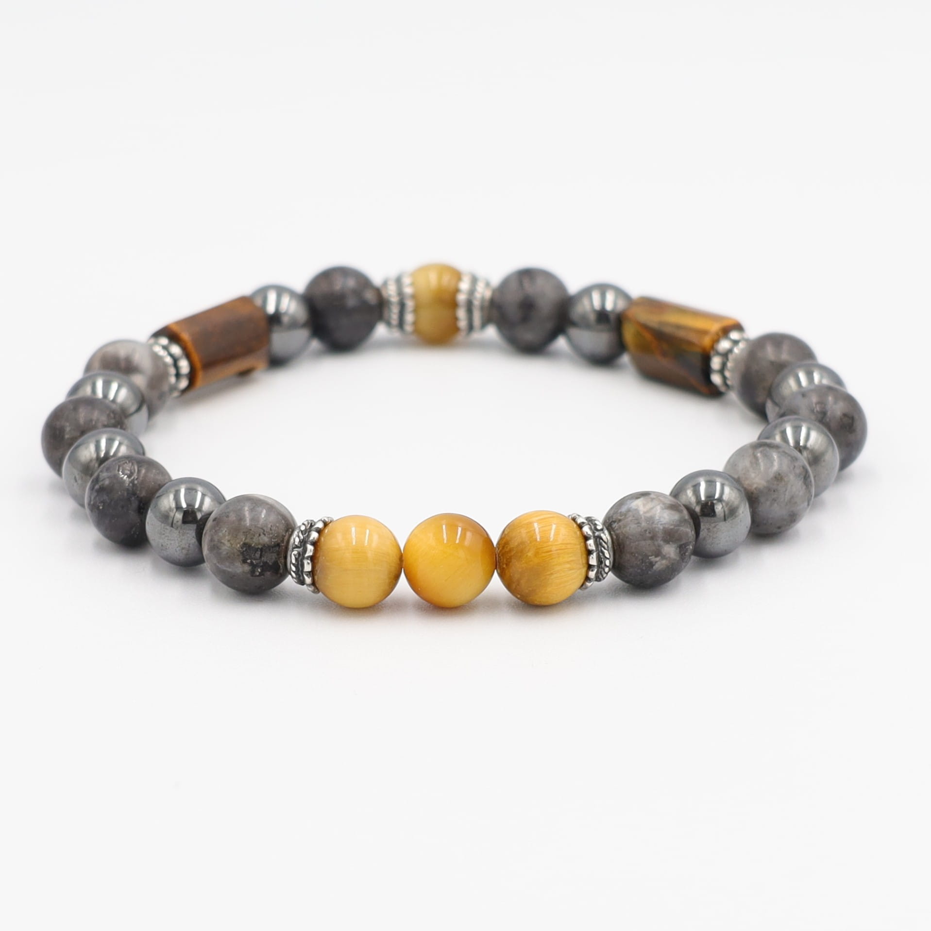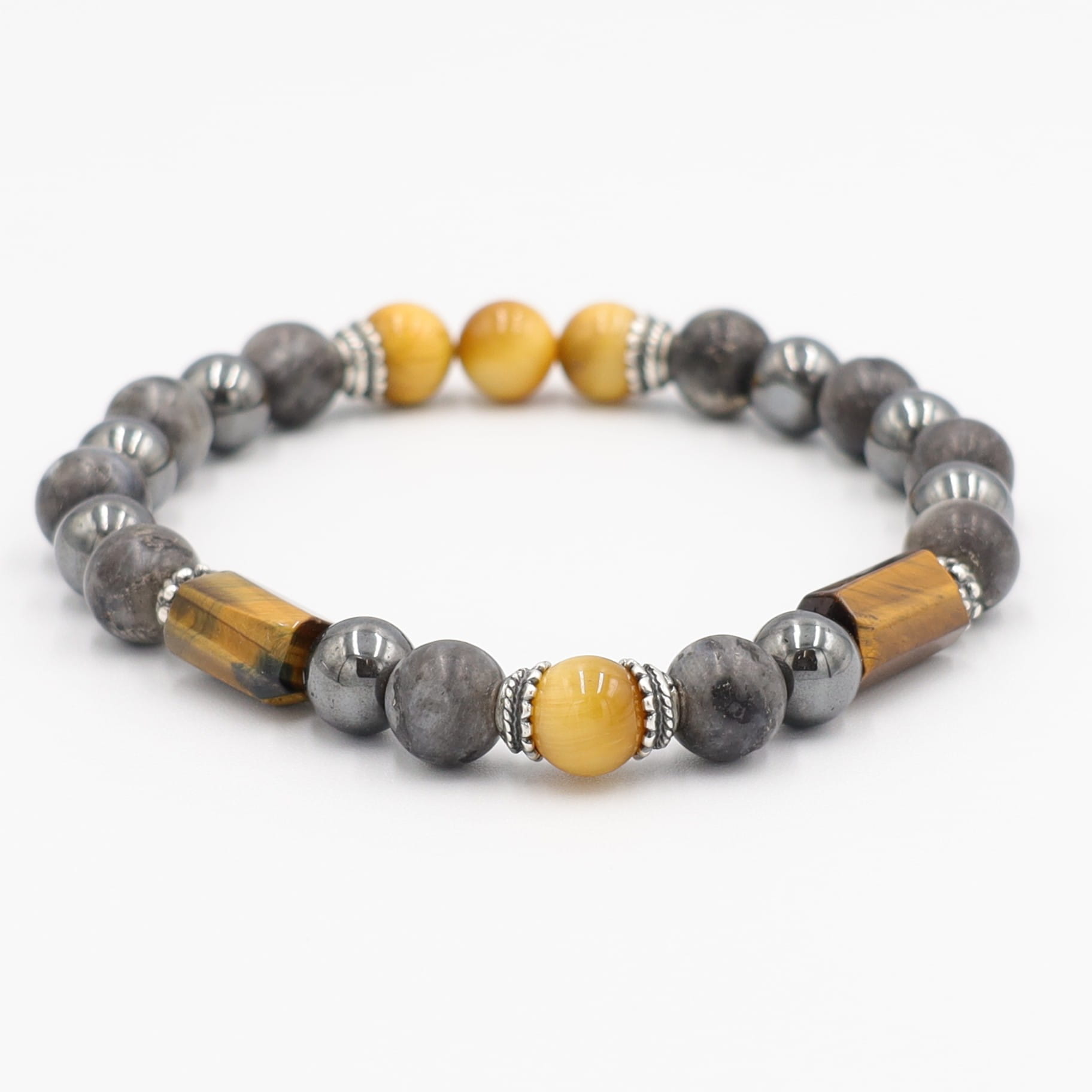 Elastyczna bransoleta męska; skomponowana z okrągłych, matowych kamieni naturalnych larvikitu (8mm); błyszczącego hematytu (8mm) i półszlachetnego, złotego tygrysiego oka (kula 8mm i walce ok 12 mm/7 mm). Uzupełnienie stanowią przekładki w stylu retro, ze srebra oksydowanego 925.