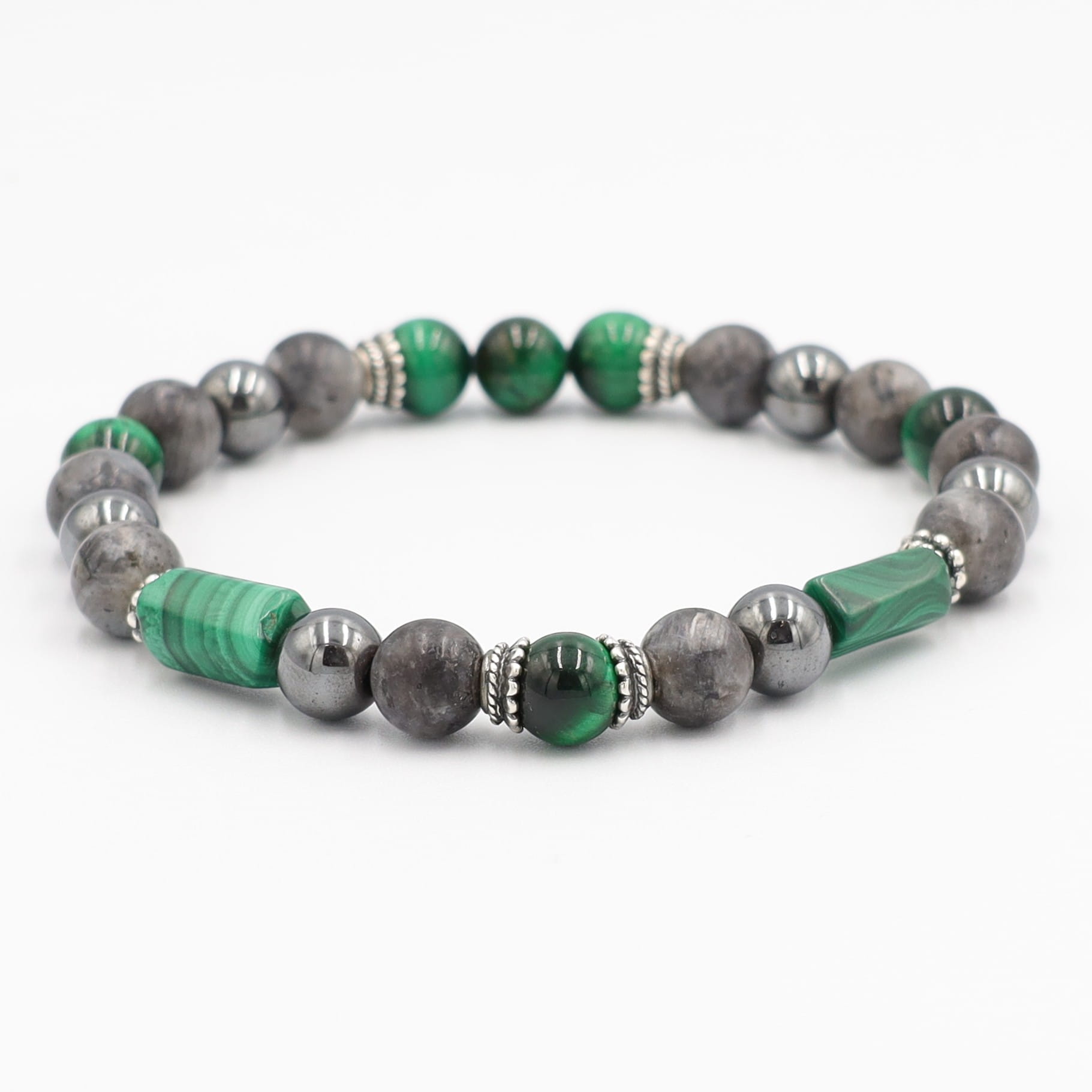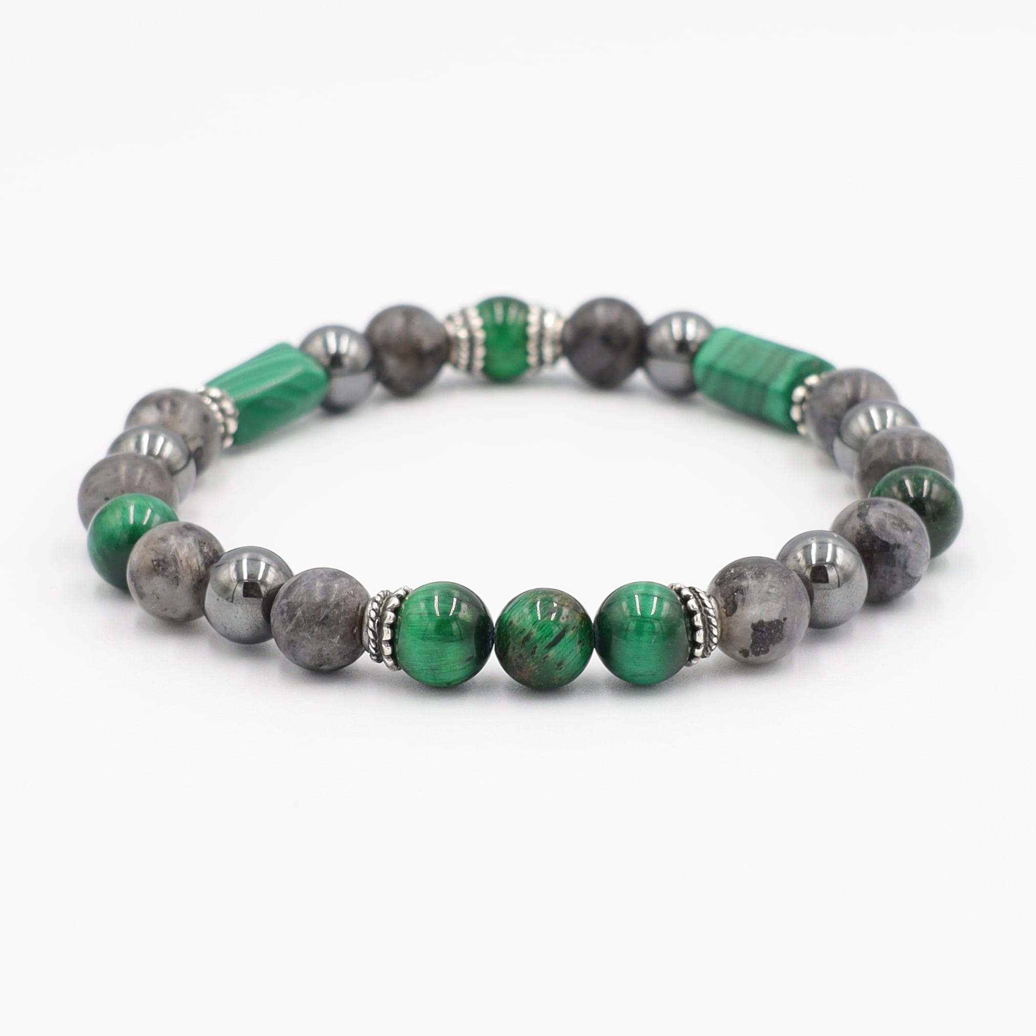 Elastyczna bransoleta męska; skomponowana z okrągłych, matowych kamieni naturalnych larvikitu; błyszczącego hematytu; półszlachetnego, zielonego tygrysiego oka oraz szlachetnego malachitu w postaci walca. Uzupełnienie stanowią przekładki w stylu retro, ze srebra oksydowanego 925.
