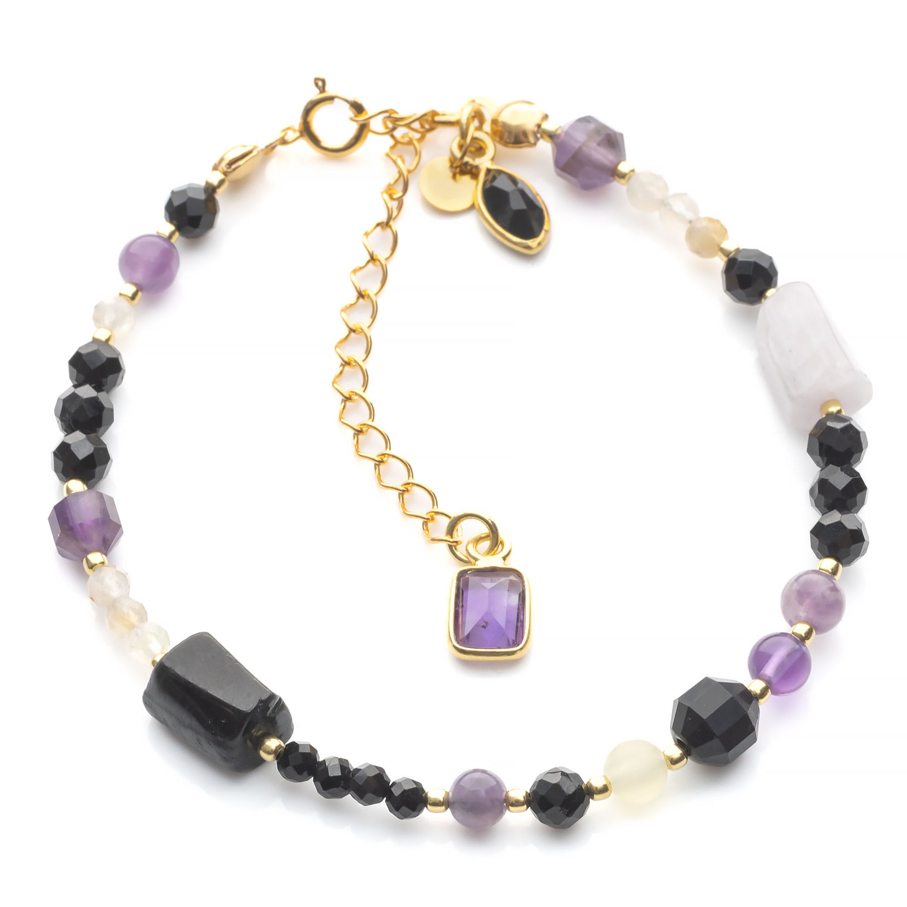 Bransoletka w odcieniach fioletu i czerni, wykonana z ametystu, ametystu lawendowego, turmalinu AAA oraz cytrynu, hiperstenu i onyksu. Uzupełniona elementami ze srebra 925, pozłacanego 24 k złotem (ciemno-żółte). Ametyst jest kamieniem półszlachetnym, zwykle przybiera kolor fioletowy o różnych stopniach nasycenia i uznaje się go za jedną z najpiękniejszych odmian kwarcu. W obecnym wzorze wykorzystano ametyst w postaci gładkiej kulki 4mm i tzw "beczki" ok 6/7mm. Ametyst lawendowy występuje tu w formie szlifowanego walca i ma nietuzinkowy, blado-fioletowy kolor. W formie walca również czarny, posiadający złotą poświatę, porównywaną do plamy oleju-hipersten. Cytryn jest rzadką, żółtą odmianą kwarcu. Jest to kamień przezroczysty, a żółte zabarwienie zawdzięcza śladowym ilością żelaza, naturalnie występującym w jego budowie. Odcień cytrynu jest niespotykany wśród innych, naturalnie występujących kamieni - naturalny cytryn jest bladożółty. W obecnym wzorze wykorzystano kamienie fasetowane o średnicy 3mm. Turmaliny są zaś rzadkimi kamieniami szlachetnymi o różnorodnych barwach i właściwościach. Tutaj czarne, fasetowane turmaliny o średnicy 3mm i 4mm. Podczas klasyfikacji turmalinów ocenia się ich kolor, połysk, czystość oraz szlif, klasa AAA oznacza najwyższą ocenę w każdej z wymienionych kategorii. Uzupełnienie stanowią zawieszki z ametystu i onyksu w okuciu. Produkt wykonany ręcznie w Polsce. Opakowanie widoczne na zdjęciu wliczone jest w cenę.