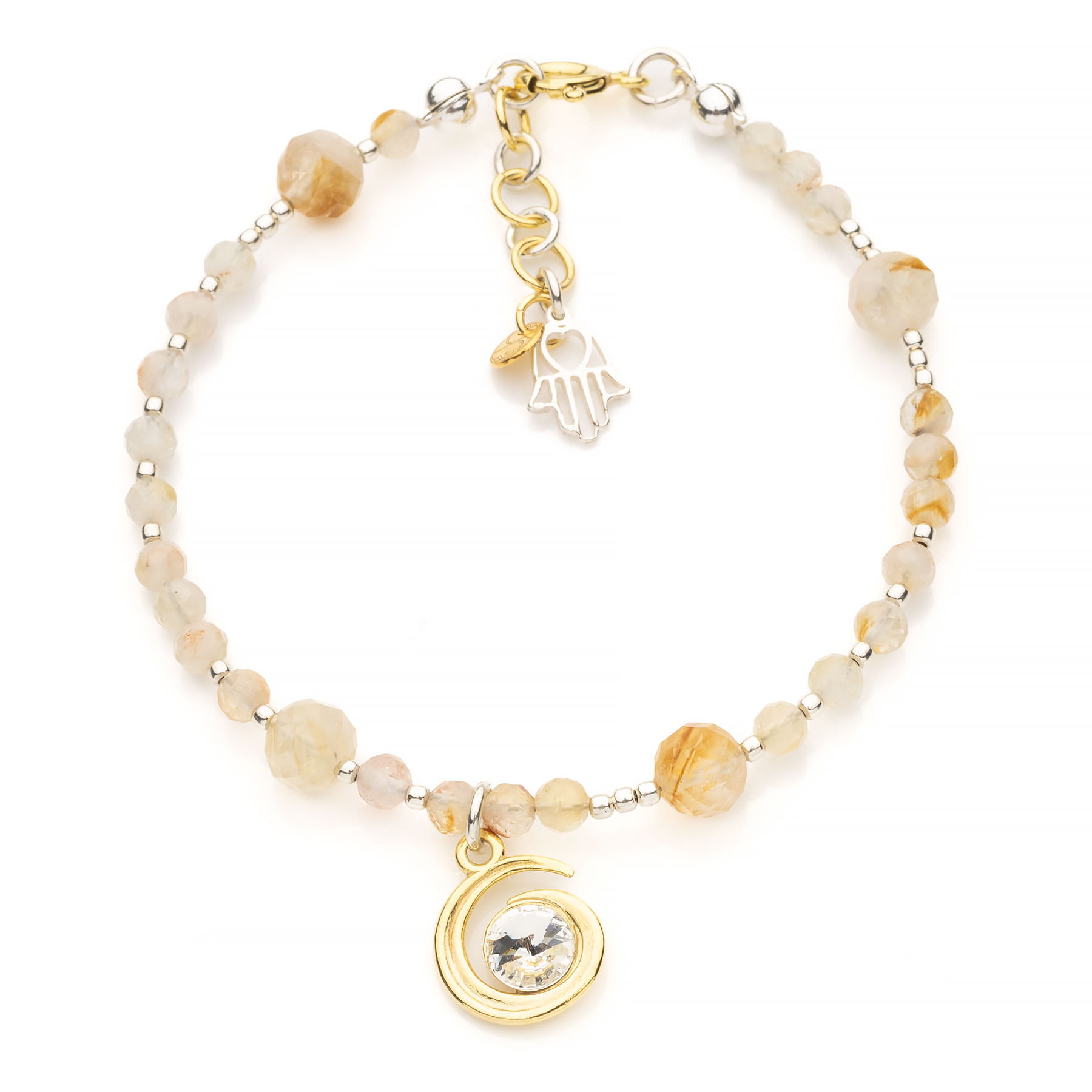 Bransoletka wykonana z błyszczących, naturalnych cytrynów o średnicy 4mm i 8mm oraz srebra i srebra pozłacanego 18-k złotem (jasno żółte). Cytryn jest transparentnym kamieniem półszlachetnym, a żółte zabarwienie zawdzięcza śladowym ilością żelaza, naturalnie występującym w jego budowie. Bransoletka uzupełniona nietuzinkowym połączeniem dwóch kolorów srebra próby 925 w postaci drobnych przekładek, księżyca z wklejonym kryształem Gavbari i przedłużki z dużych, łączonych kółeczek, zakończonej ręką Fatimy. Biżuteria wykonana ręcznie w Polsce. Opakowanie widoczne na zdjęciu wliczone jest w cenę.