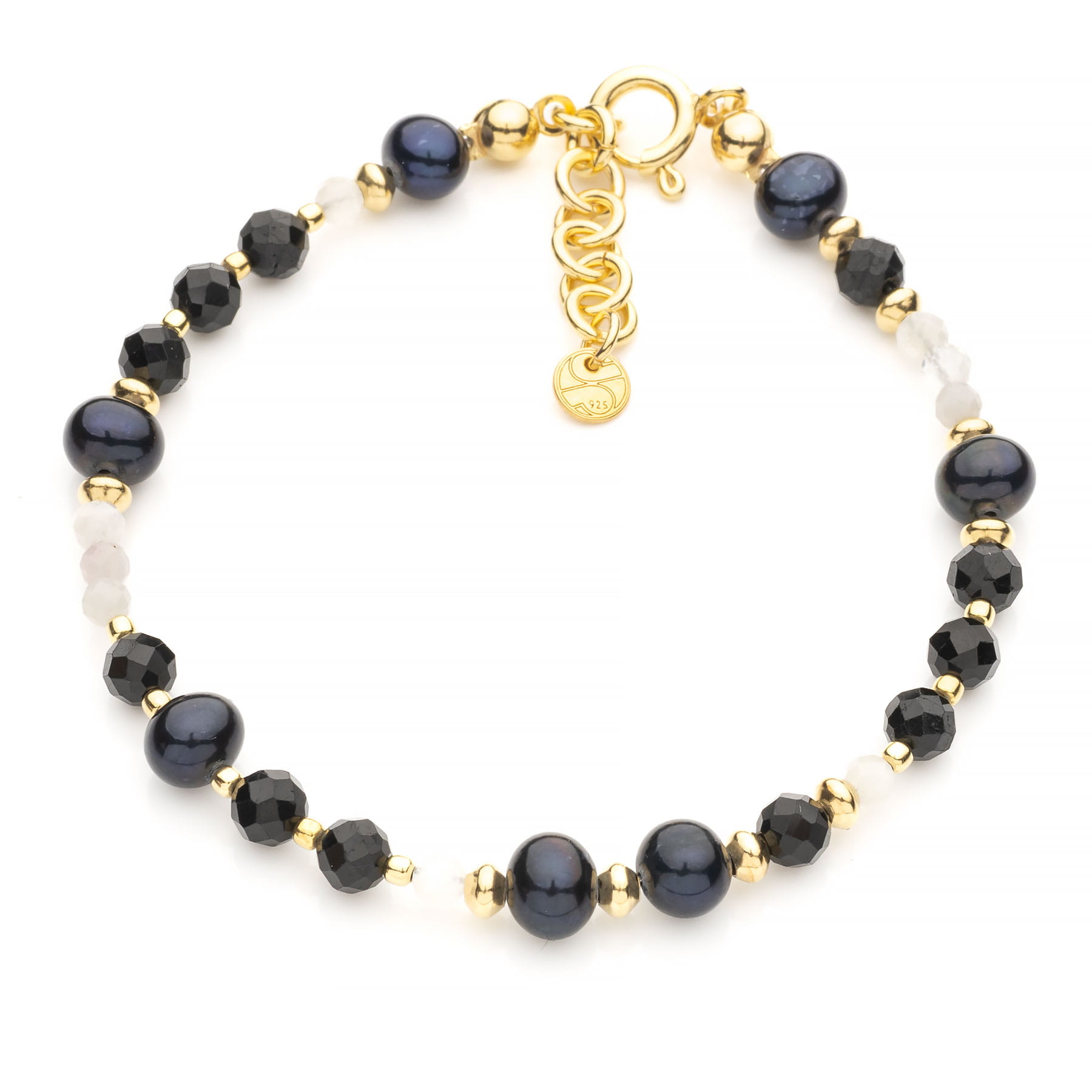 Bransoletka z czarnej perły, turmalinu AAA i kamienia księżycowego, srebro pozłacane