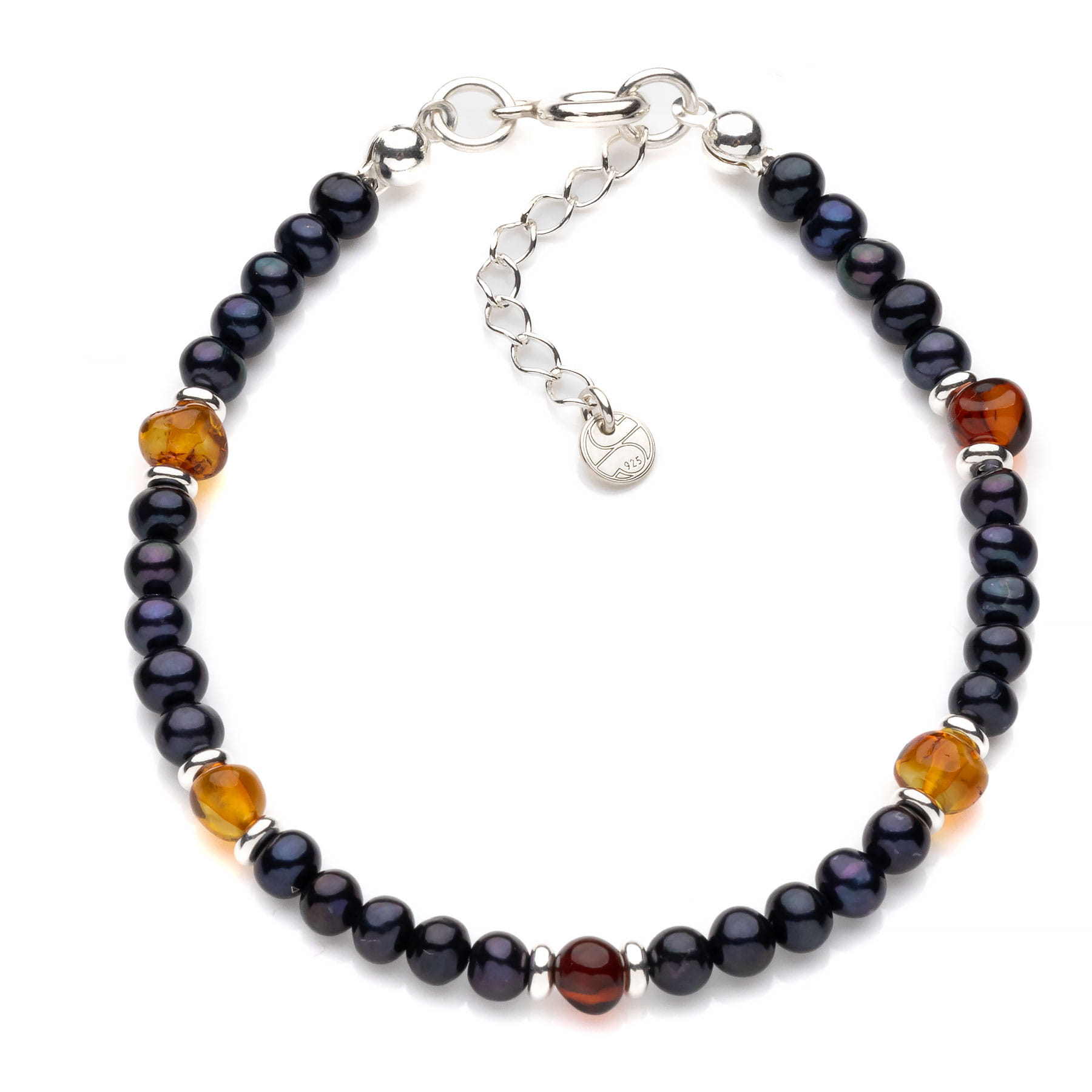 Bransoletka z czarnych pereł słodkowodnych i bursztynu bałtyckiego, srebro
