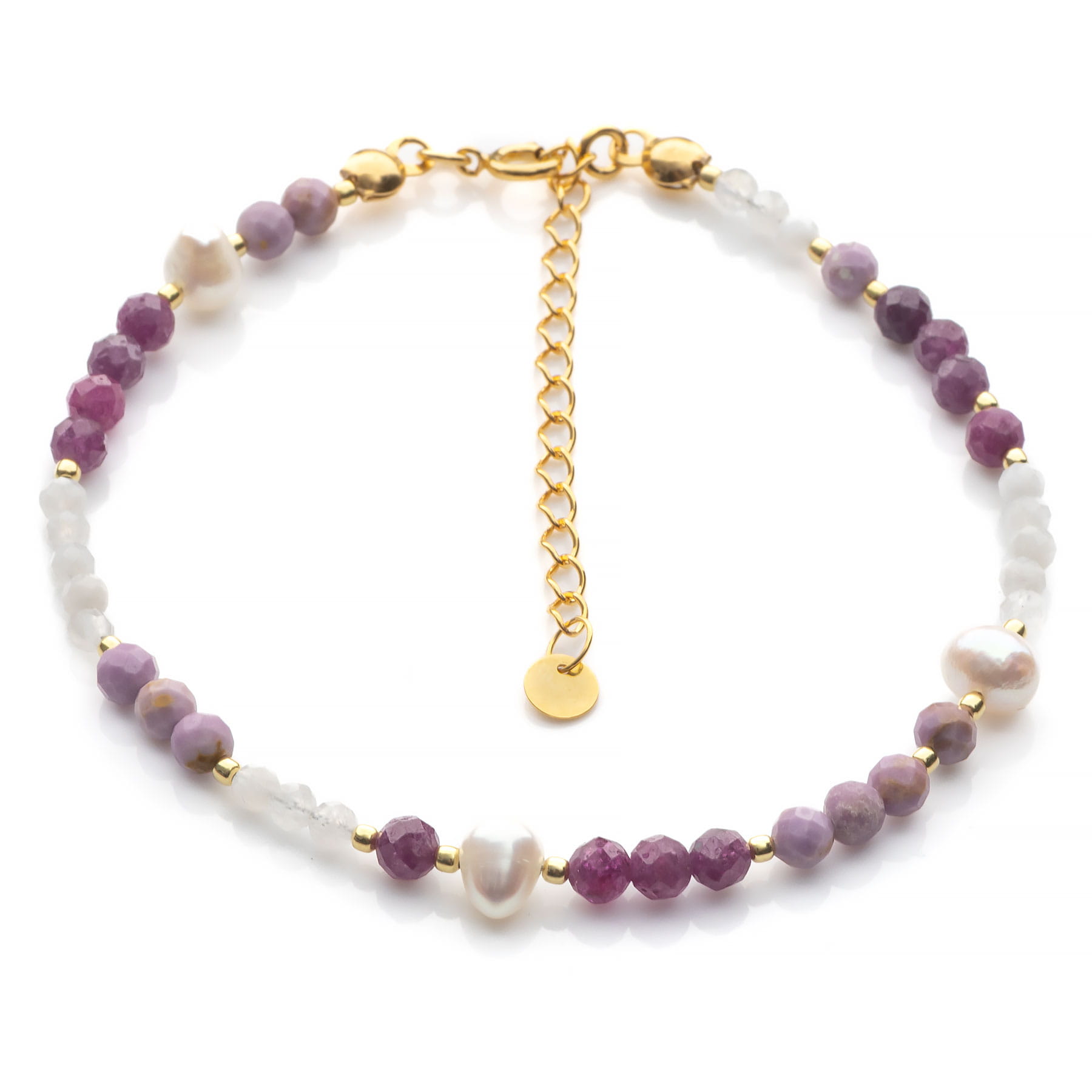 Bransoletka wykonana z błyszczących, fasetowanych kamieni naturalnych w postaci fosfosyderytu, kamienia księżycowego, pereł słodkowodnych i szlachetnego rubinu o średnicy 4mm. Bransoletka w klasycznym połączeniu odcieni ciemnego/brudnego różu i bieli, wzbogacona elementami ze srebra pozłacanego pierwszej próby 925. Rubin ujawnia na swojej powierzchni charakterystyczne inkluzje, prążki i wtrącenia, które stanowią o autentyczności kamienia. Minerały szlachetne różnią się także nasyceniem barwy. Fosfosyderyt to kamień naturalny w odcieniu brudnego różu, posiadający liczne, złote cząsteczki pirytu. Perły są wytworami małży, wyznacznikiem ponadczasowej elegancji, kobiecości, delikatności i stylu, kojarzą się z luksusem i nigdy nie przestaną być modne. W naszej kolekcji używamy wysokogatunkowych pereł słodkowodnych, które wytwarzane są przy bardzo znikomej ingerencji człowieka. Wzór uzupełniają drobne (3mm), pięknie błyszczące i tęczujące kamienie księżycowe. Produkt wykonany ręcznie w Polsce. Opakowanie widoczne na zdjęciu wliczone jest w cenę.