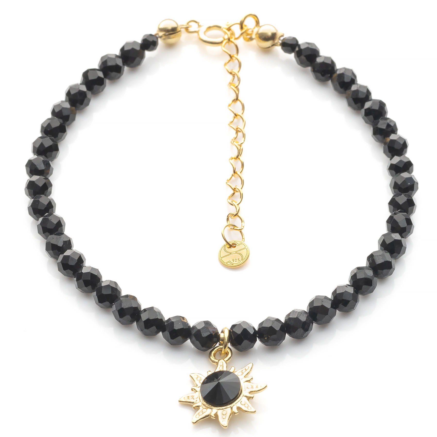 Bransoletka wykonana z błyszczącego, szlachetnego, czarnego turmalinu klasy AAA oraz srebra pierwszej próby 925, pozłacanego 18-karatowym złotem (jasno żółte). Turmaliny należą do minerałów rzadkich, występują w różnych kolorach i wykazują niezwykłe właściwości. Bez wątpienia są to jedne z najbardziej nietuzinkowych i fascynujących kamieni szlachetnych oraz jedne z najchętniej wykorzystywanych do tworzenia naszej biżuterii. Aby dobrać paciorki zbliżone do siebie barwą i strukturą, należy dokonać selekcji ogromnej ilości tego drogocennego kamienia. W obecnym modelu wykorzystano kamienie o średnicy 4mm, w odcieniu głębokiej czerni z ledwie widocznymi na pierwszy rzut oka przebarwieniami w różnych odcieniach. Podczas klasyfikacji turmalinów ocenia się ich kolor, połysk, czystość oraz szlif, klasa AAA oznacza najwyższą ocenę w każdej z wymienionych kategorii. Uzupełnienie stanowi zawieszka w postaci słońca z fasetowanym, błyszczącym onyksem. Produkt został wykonany ręcznie w Polsce. Opakowanie widoczne na zdjęciu wliczone jest w cenę.