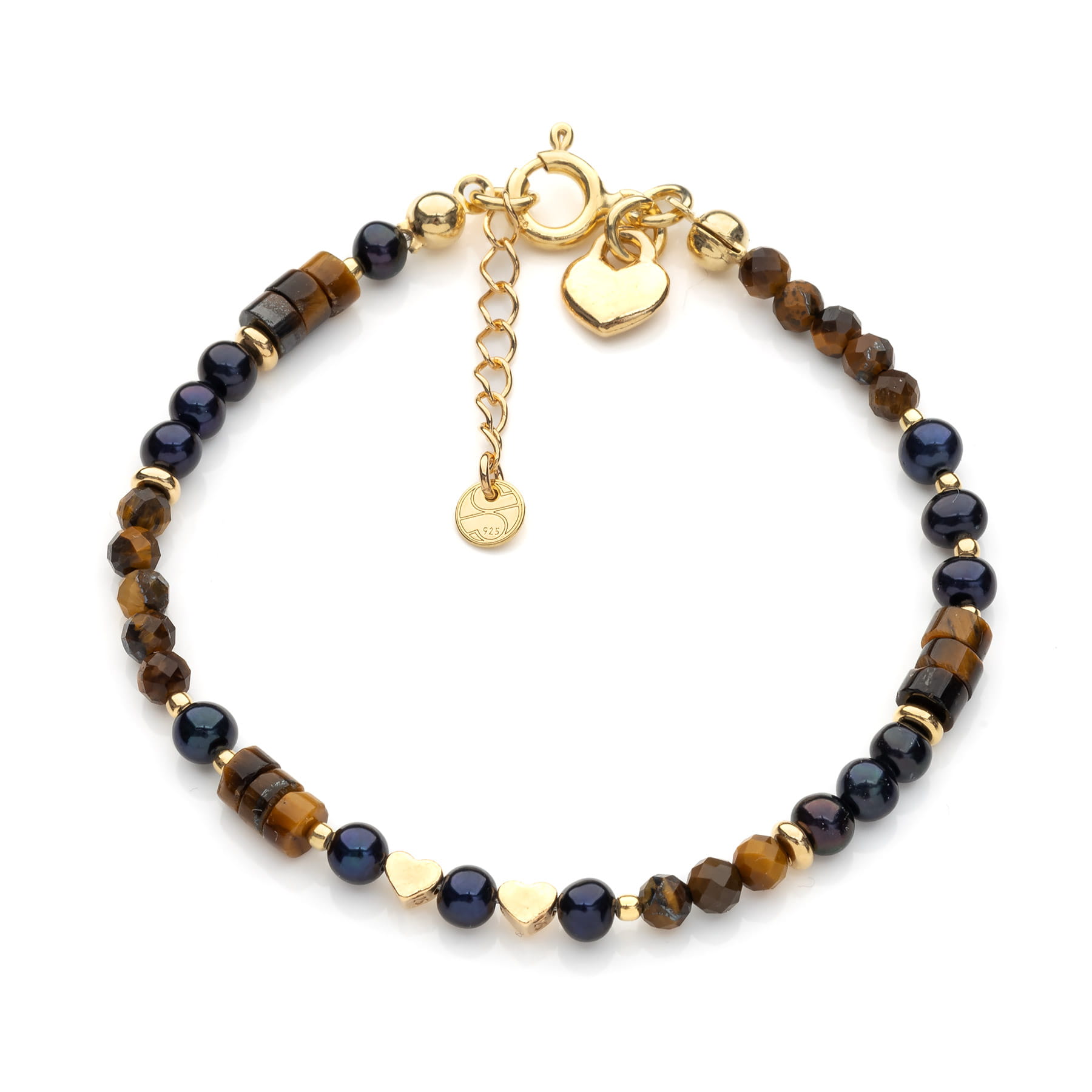 Bransoletka wykonana z tygrysiego oka klasy AA w postaci fasetowanych kulek o średnicy 4mm i gładkich plastrów 4x5mm oraz czarnych pereł słodkowodnych o średnicy ok 4mm. Tygrysie oko, mieni się barwami złota, karmelu i różnych odcieni brązu. Naturalne tygrysie oko można łatwo rozpoznać po połyskujących pasmach, przypominających te na sierści dzikiego kota. Kamień zawdzięcza swoją nazwę niezwykłemu efektowi optycznemu – w blasku słońca lśni i migocze, a połyskujące jasne pasmo przemieszcza się podczas poruszania kamieniem. Perły słodkowodne przybierają różne wielkości, kształty i jeśli są prawdziwe-nie będą idealnie okrągłe. Ich główną, charakterystyczną cechą jest tęczowanie - białe perły posiadają powłokę mieniącą się w rozmaitych odcieniach tęczy, czarne zaś głównie granatową lub benzynową. Tutaj perły czarne, wielkości około 4mm. Biżuteria z perłami i kamieniami naturalnymi w klasycznym połączeniu kolorów jest niezwykle elegancka i nigdy nie przestanie być modna. Biżuterię uzupełniono elementami dekoracyjnymi, wykonanymi ze srebra pozłacanego 18-k złotem (jasno żółte) w tym zawieszką w postaci serduszka-kłódki, zamocowaną przy zapięciu. Elegancka, ponadczasowa bransoletka z kamieni i pereł wysokiej klasy, która doskonale sprawdzi się jako uzupełnienie stylizacji wieczorowych lub nietuzinkowy prezent dla wyjątkowej osoby. Biżuteria wykonana ręcznie w Polsce. Opakowanie widoczne na zdjęciu wliczone jest w cenę.