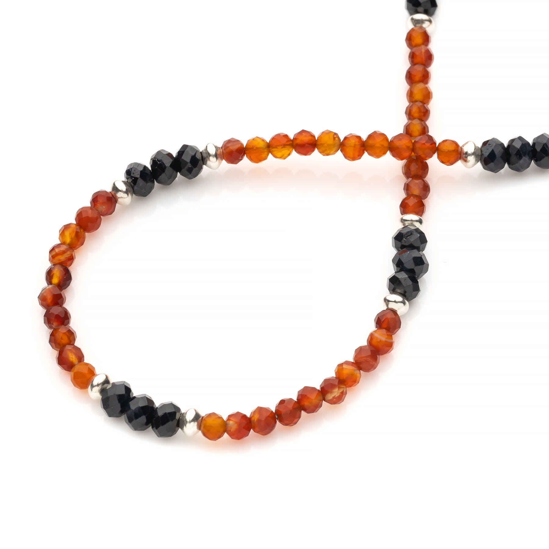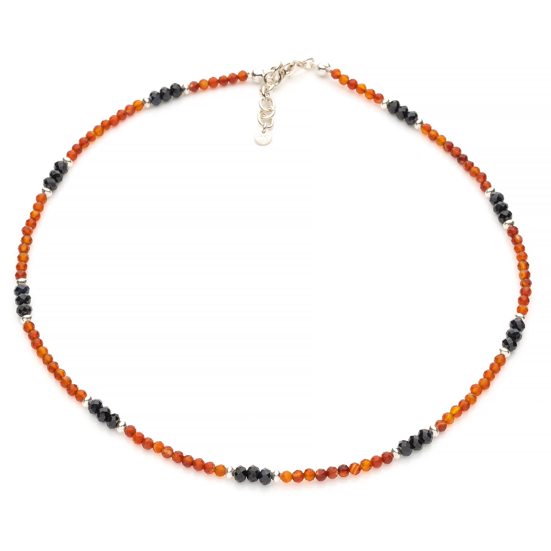 Krótki naszyjnik typu choker, wykonany z naturalnych, fasetowanych kamieni agatu karneolowego klasy AA o średnicy 3mm; szlachetnych szafirów w postaci ścinanych jubilersko oponek około 4x4,5mm oraz srebra pierwszej próby 925. Agat karneol jest kamieniem półszlachetnym, występuje w różnych odcieniach barwy pomarańczowej, o zróżnicowanym nasyceniu i transparentności. Szafiry wykorzystane w tym modelu mają nasyconą, ciemno granatową barwę i pięknie mienią się w słońcu. Biżuteria wykonana ręcznie w Polsce. Opakowanie widoczne na zdjęciu wliczone jest w cenę.