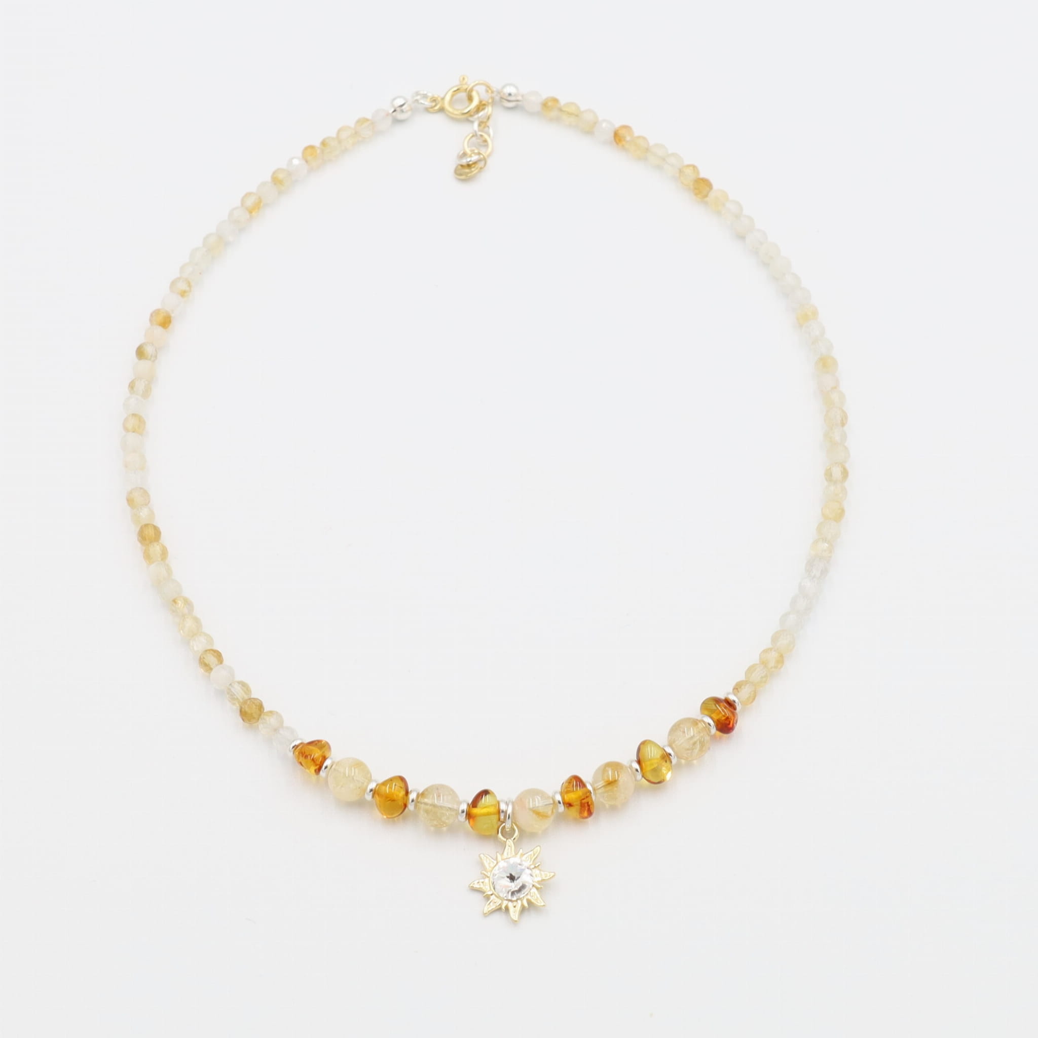 Krótki naszyjnik typu choker wykonany z błyszczących, fasetowanych, naturalnych cytrynów i bursztynu bałtyckiego oraz srebra i srebra pozłacanego 18-k złotem (jasno-żółte). Cytryn jest rzadką, żółtą odmianą kwarcu. Jest to kamień przezroczysty, a żółte zabarwienie zawdzięcza śladowym ilością żelaza, naturalnie występującym w budowie tego minerału. Odcień cytrynu jest niespotykany wśród innych, naturalnie występujących kamieni. Bursztyn to wyjątkowo lekka substancja organiczna powstała z żywicy drzew iglastych, takich jak sosny i świerki. Może przybierać wiele kolorów, od mleczno-żółtego, przez złoty, brązowy aż po koniakowy i czerwony. Od wieków stanowi pożądany i drogocenny materiał, wykorzystywany w jubilerstwie. Do tworzenia naszej biżuterii używamy bursztynu bałtyckiego - powstałą w sposób naturalny żywicę, którą skrywa morze. Niektóre kawałki bursztynu zawierają zamknięte w sobie szczątki roślin i zwierząt, takie jak insekty, pajęczaki a nawet krople krwi dinozaurów. Bursztyny z takimi inkluzjami są szczególnie cenne. Naszyjnik uzupełnia zawieszka - słońce z wklejonym kryształem Gavbari. Produkt wykonany ręcznie w Polsce. Opakowanie widoczne na zdjęciu wliczone jest w cenę.