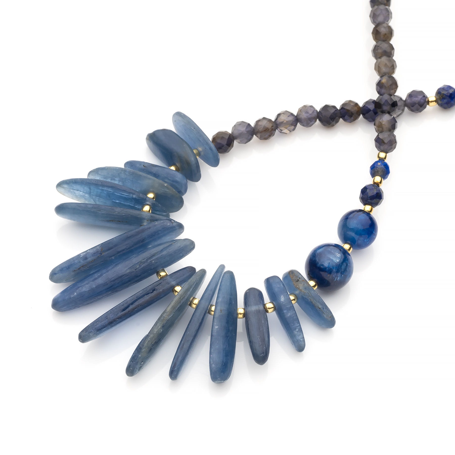 Krótki naszyjnik typu choker wykonany z półszlachetnych, błyszczących kamieni lapisu lazuli i lolitu, oraz szlachetnego kianitu i srebra pierwszej próby 925, pozłacanego 18-karatowym złotem (jasno żółte). Lapis lazuli –"Kamień Nieba”-wyróżnia się szlachetną, intensywnie niebieską barwą i świetnie komponuje ze srebrem oraz złotem. Za najcenniejsze uważane są kamienie ciemne, wyróżniające się intensywnym, równomiernie rozmieszczonym zabarwieniem oraz te, które zawierają mieniące się złotem cząsteczki pirytu. Ciemne, drobne kamienie o średnicy 4mm, przeplatają się tutaj z transparentnym lolitem o stłumionym, niebiesko-fioletowo-miedzianym zabarwieniu, również w rozmiarze 4mm. Kianit jest zaś kamieniem szlachetnym łączącym w sobie kolory błękitu i granatu. Posiada w swojej strukturze rozmyte wtrącenia o różnym nasyceniu barwy. Tutaj kianit w formie długich sopli oraz ciemnych kulek o średnicy 6mm i 8mm. Biżuteria została wykonana ręcznie w Polsce. Opakowanie widoczne na zdjęciu wliczone jest w cenę.
