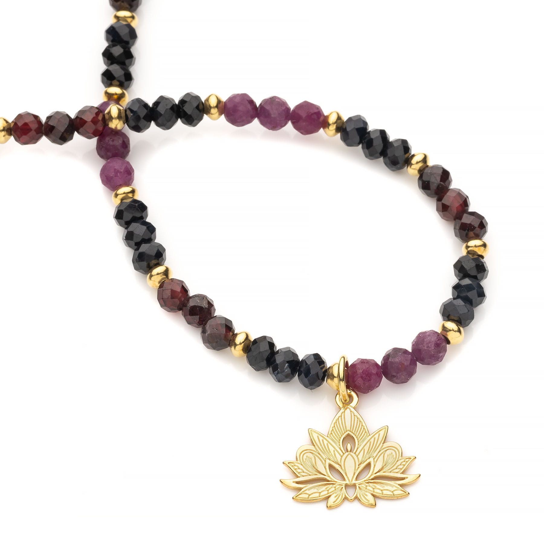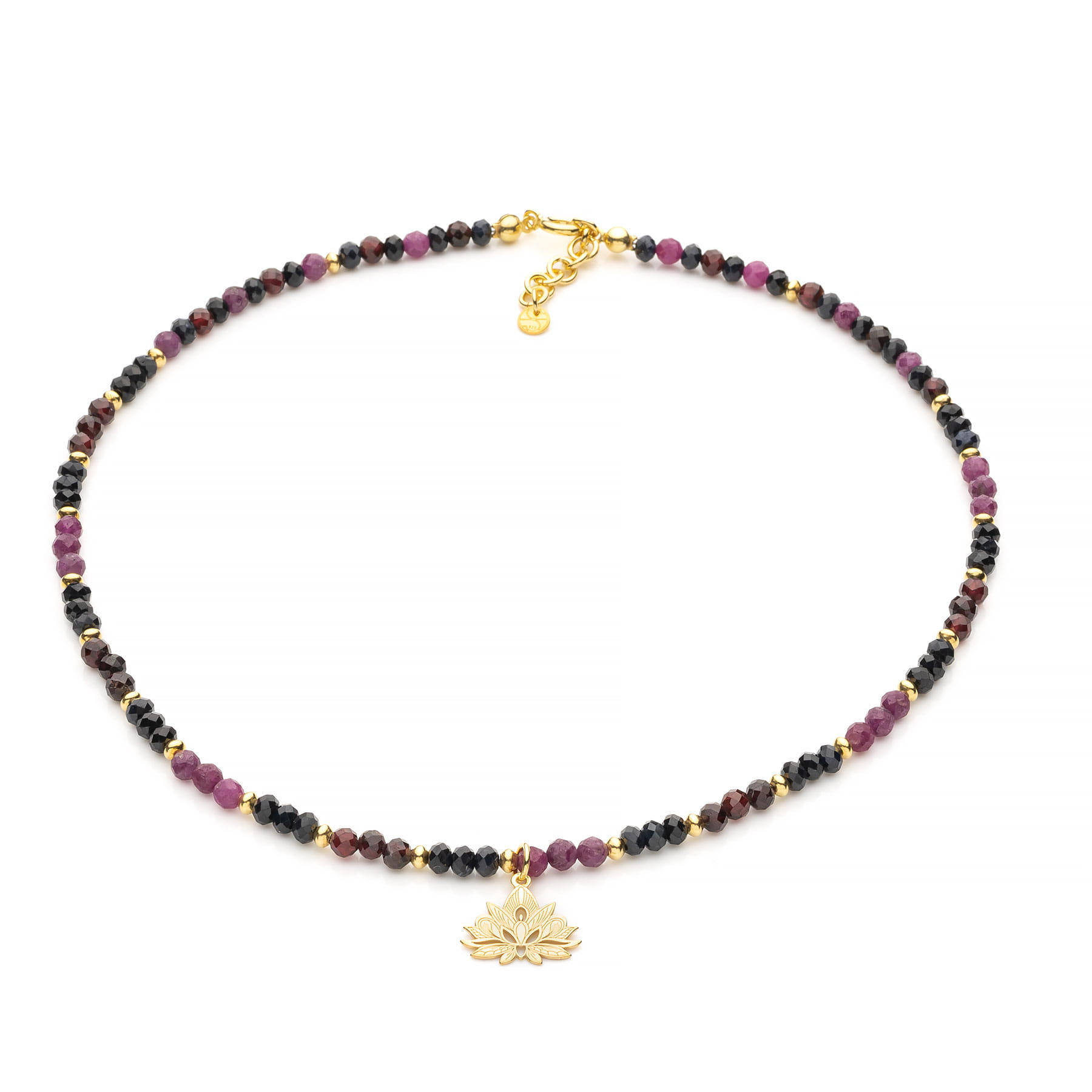 Krótki naszyjnik typu choker, wykonany z naturalnego, ciemnego szafiru w formie fasetowanych oponek o średnicy 4x5mm, rubinów i granatów w postaci fasetowanych kulek o średnicy 4mm oraz srebra pierwszej próby 925, pozłacanego 18-karatowym złotem (jasno żółte). Szafiry są kamieniami szlachetnymi o głębokim, chabrowym kolorze. Jest to drugi, najtwardszy minerał, zaraz po diamencie a jego głęboka, niemal czarna barwa świadczy o autentyczności i wysokiej jakości kamienia (szafiry syntetyczne są znacznie jaśniejsze niż naturalne, często również bardziej błyszczące). Granat jest kamieniem szlachetnym przybierającym różne odcienie czerwieni, które wydają się zmieniać barwę pod względem rodzaju oświetlenia. Granat jest transparentny lub półtransparentny, posiada naturalne wrostki oraz "ubytki". We wzorze wykorzystano granaty w odcieniu czerwonego wina. Idealne uzupełnienie kolorystyczne naszyjnika stanowią surowe, matowe rubiny w kolorze ciemnego różu oraz zawieszka w postaci kwiatu lotosu, wykonana ze srebra pierwszej próby 925, pozłacanego 18k złotem (jasno-żółte). Elegancki, ponadczasowy naszyjnik z kamieni szlachetnych, który doskonale sprawdzi się jako uzupełnienie stylizacji zarówno codziennych jak i wieczorowych lub nietuzinkowy prezent dla wyjątkowej osoby. Biżuterię wykonano ręcznie, w Polsce. Opakowanie widoczne na zdjęciu wliczone jest w cenę.
