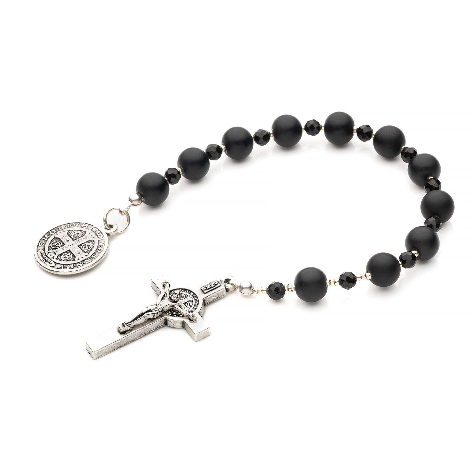 Męska dziesiątka otwarta, wykonana z błyszczącego, szlachetnego, czarnego turmalinu klasy AAA o średnicy 4mm oraz matowego onyksu o średnicy 8mm, a także metalowych podzespołów włoskich najwyższej jakości w postaci krzyża i łącznika św. Benedykta. Turmaliny należą do minerałów rzadkich, występują w różnych kolorach i wykazują niezwykłe właściwości. Bez wątpienia są to jedne z najbardziej nietuzinkowych i fascynujących kamieni szlachetnych oraz jedne z najchętniej wykorzystywanych do tworzenia naszej biżuterii. Aby dobrać paciorki zbliżone do siebie barwą i strukturą, należy dokonać selekcji ogromnej ilości tego drogocennego kamienia. W obecnym modelu wykorzystano kamienie o średnicy 4mm, w odcieniu głębokiej czerni z ledwie widocznymi na pierwszy rzut oka przebarwieniami w różnych odcieniach. Podczas klasyfikacji turmalinów ocenia się ich kolor, połysk, czystość oraz szlif - klasa AAA oznacza najwyższą ocenę w każdej z wymienionych kategorii. Produkt został wykonany ręcznie w Polsce. Opakowanie widoczne na zdjęciu wliczone jest w cenę.