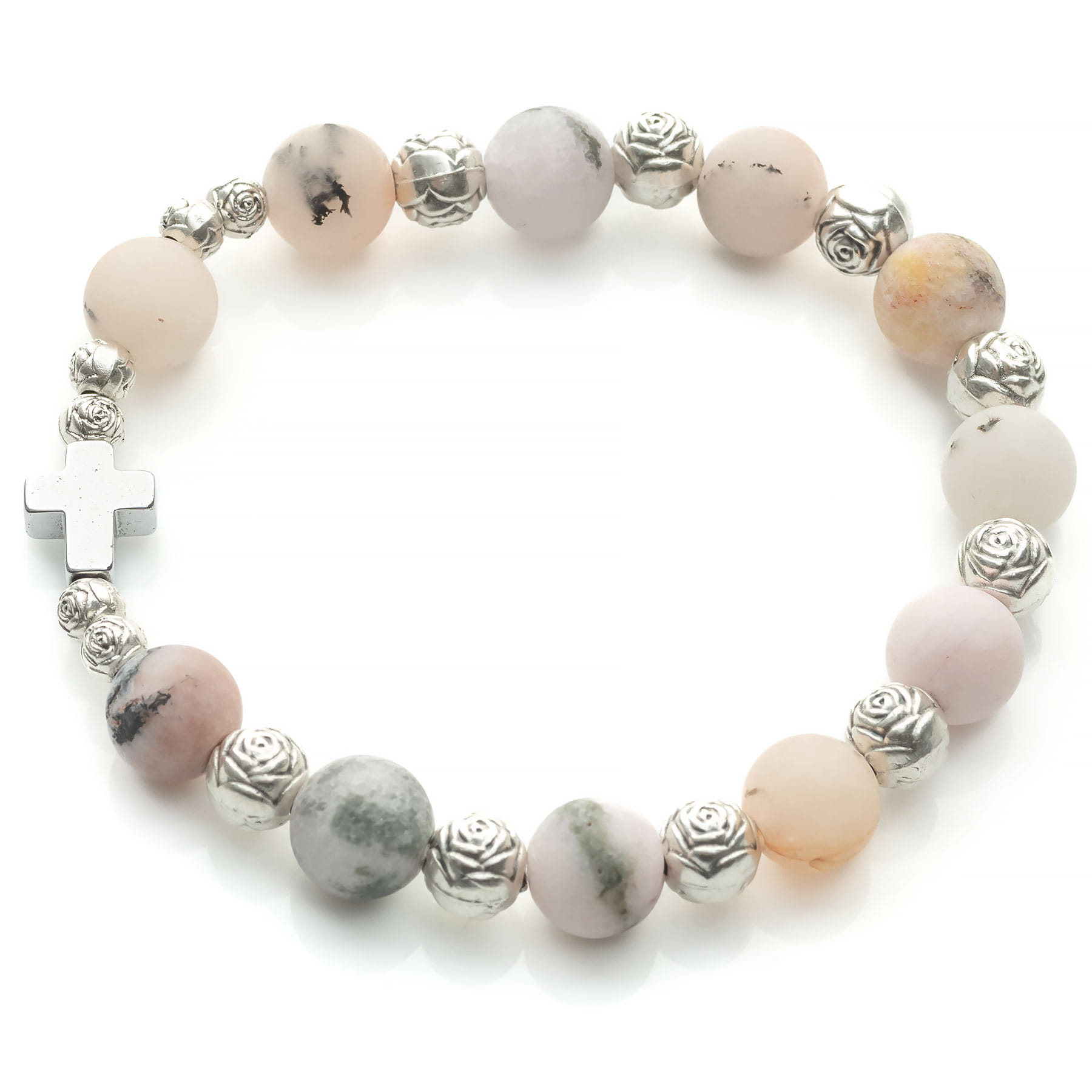 Bardzo wygodny różaniec na rękę, wykonany z opalu różowego, który jest nieprzezroczystą wersją tego minerału. Paciorki w tęczowych kolorach charakteryzują się nie tylko wyjątkowo dużym bogactwem barw, lecz także różnorodnością plamek, wtrąceń i spękań, które zmieniają się w zależności od kąta obserwacji. W obecnym wzorze wykorzystano okrągłe kamienie matowe wielkości 8mm. Metalowe różyczki najwyższej jakości wykonane we Włoszech, krzyżyk hematytowy. Dziesiątka w jasnych kolorach stanowi subtelny upominek religijny dla bliskiej osoby i jest dobrym pomysłem na prezent, gdy nie znamy dokładnego rozmiaru nadgarstka. Produkt wykonany ręcznie w Polsce. Opakowanie widoczne na zdjęciu wliczone jest w cenę.
