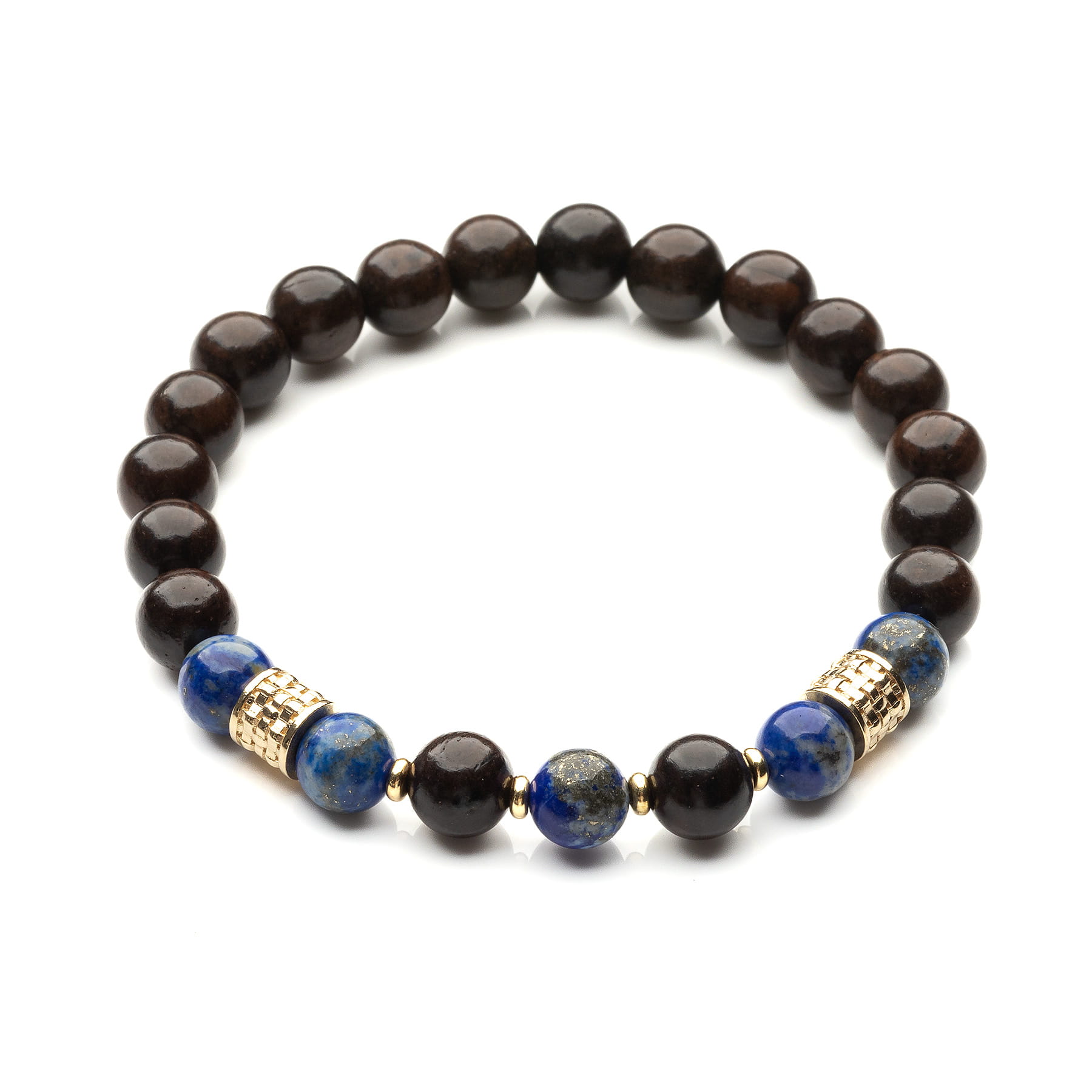 Ręcznie wykonana, elastyczna bransoleta męska, której bazę stanowią wyjątkowo lekkie, ciemno brązowe paciorki egzotycznej gruszy chińskiej o średnicy 8mm; uzupełniona niezwykłej urody kamieniem półszlachetnym - lapisem lazuli. "Kamień Nieba”-wyróżnia się szlachetną, intensywnie niebieską barwą i świetnie komponuje ze srebrem oraz złotem. Za najcenniejsze uważane są kamienie ciemne, wyróżniające się intensywnym, równomiernie rozmieszczonym zabarwieniem oraz te, zawierające mieniące się na złoto drobinki pirytu. Połączenie drewna egzotycznego i kamieni z plecionymi przekładkami wykonanymi ze srebra 925 złoconego 18-k złotem, (jasno żółte) tworzy elegancki wzór biżuterii na specjalne okazje jak i do noszenia na co dzień. Odpowiednia dla Panów ceniących klasykę oraz biżuterię z surowców naturalnych. Idealnie sprawdzi się jako prezent, zwłaszcza jeśli nie znamy dokładnego wymiaru nadgarstka. Produkt został zaprojektowany i wykonany ręcznie w Polsce. Opakowanie widoczne na zdjęciu wliczone jest w cenę.