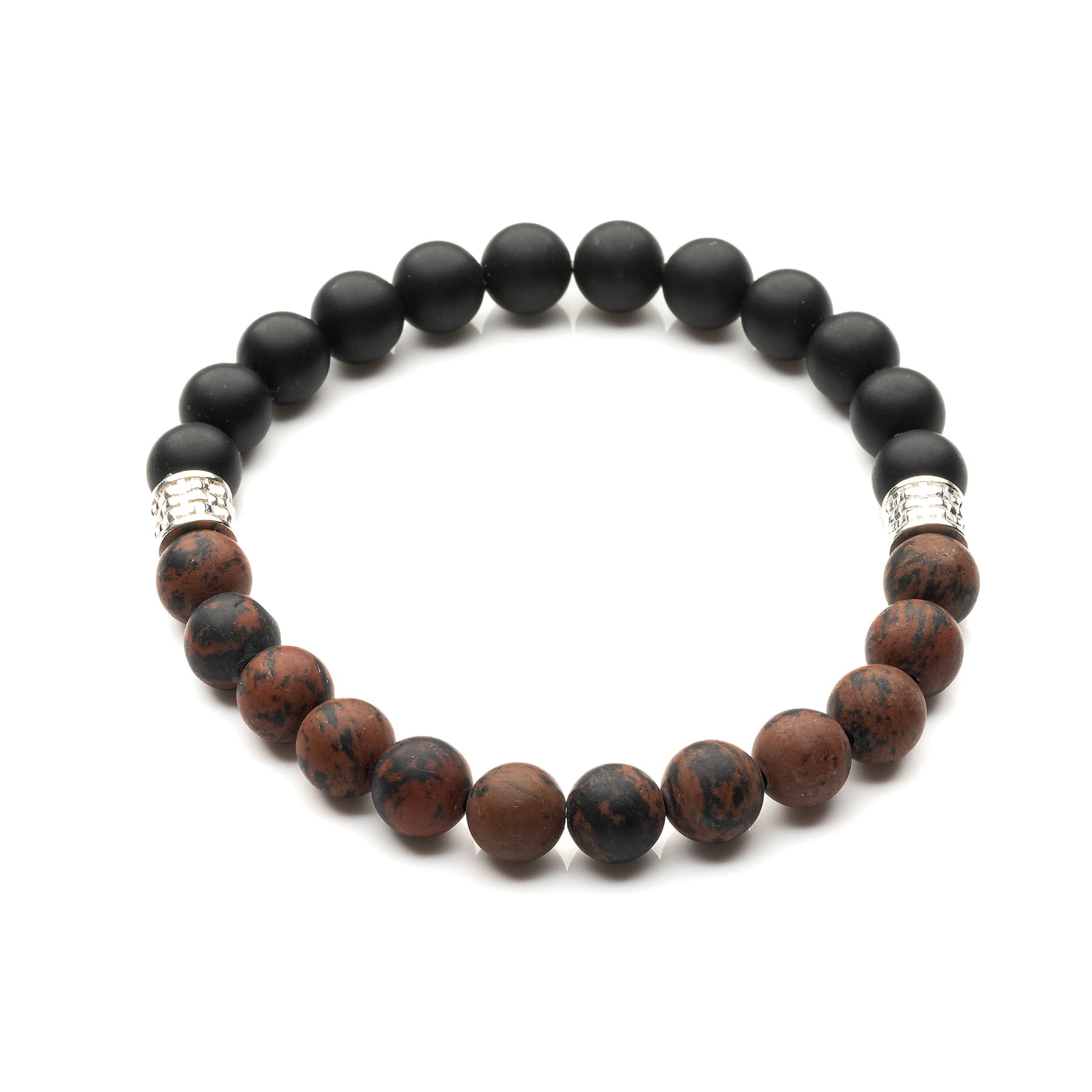 Ręcznie wykonana, elastyczna bransoleta męska, skomponowana z okrągłych, matowych kamieni naturalnych onyksu i brązowego obsydianu o średnicy 8mm. Główną, charakterystyczną cechą onyksu ukształtowaną przez naturę, są równo ułożone warstwy: dolna- czarna i górna-biała. W prezentowanym modelu użyto kamieni w odcieniu głębokiej, matowej czerni. Obsydian jest natomiast jedynym występującym w przyrodzie naturalnym szkłem, zbudowanym w całości ze szkliwa wulkanicznego. Szlifowane kamienie o czarno-ceglanej barwie na pierwszy rzut oka są zupełnie matowe, ale w słońcu uwidaczniają się błyszczące drobinki, które tworzą metaliczny odblask, powstający za sprawą pęcherzyków powietrza. Nadaje to wyjątkowego, trójwymiarowego efektu. Klasyczne połączenie barw z ozdobnymi, plecionymi przekładkami wykonanymi ze srebra pierwszej próby 925 tworzy elegancki wzór biżuterii odpowiedni zarówno na specjalne okazje jak i do noszenia na co dzień. Bransoleta dla Panów ceniących klasyczne połączenia kolorów oraz biżuterię z surowców naturalnych. Idealnie sprawdzi się jako prezent, zwłaszcza jeśli nie znamy dokładnego wymiaru nadgarstka. Produkt został zaprojektowany i wykonany ręcznie w Polsce. Opakowanie widoczne na zdjęciu wliczone jest w cenę.
