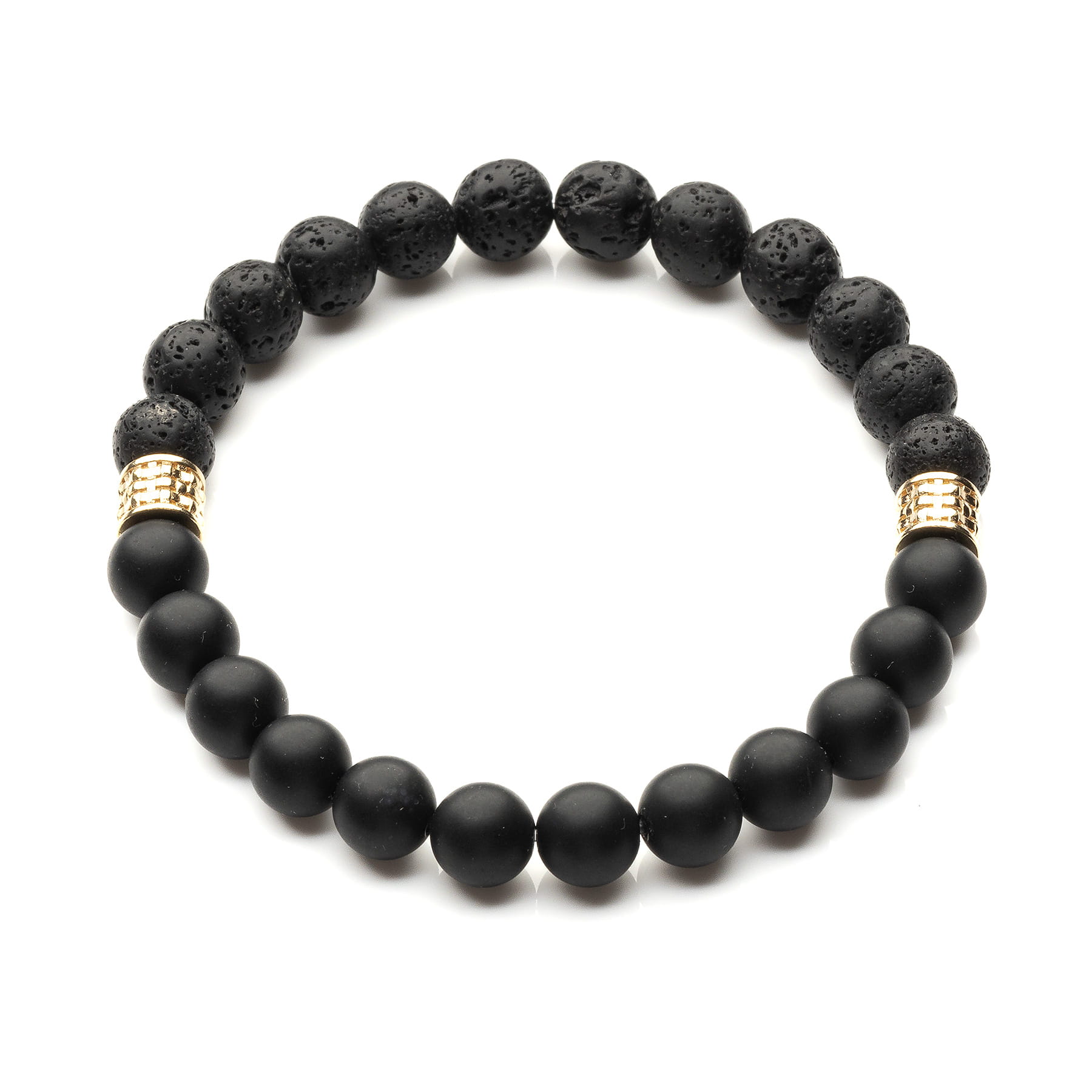 Ręcznie wykonana, elastyczna bransoleta męska, skomponowana z okrągłych kamieni naturalnych o średnicy 8mm w kolorze głębokiej, matowej czerni - onyksu oraz lawy wulkanicznej. Główną cechą onyksu, są równo ułożone warstwy: dolna- czarna i górna-biała. Lawa wulkaniczna o nieregularnej strukturze, posiada liczne wrostki co jest jej charakterystyczną cechą, ukształtowaną przez naturę. Klasyczne połączenie czerni z ozdobnymi, plecionymi przekładkami wykonanymi ze srebra 925 złoconego 18-k złotem, (jasno żółte) tworzy elegancki wzór biżuterii odpowiedni zarówno na specjalne okazje jak i do noszenia na co dzień. Odpowiednia dla Panów ceniących klasykę oraz biżuterię z surowców naturalnych. Dzięki uniwersalnemu połączeniu idealnie sprawdzi się jako prezent, zwłaszcza jeśli nie znamy dokładnego wymiaru nadgarstka. Produkt został zaprojektowany i wykonany ręcznie w Polsce. Opakowanie widoczne na zdjęciu wliczone jest w cenę.