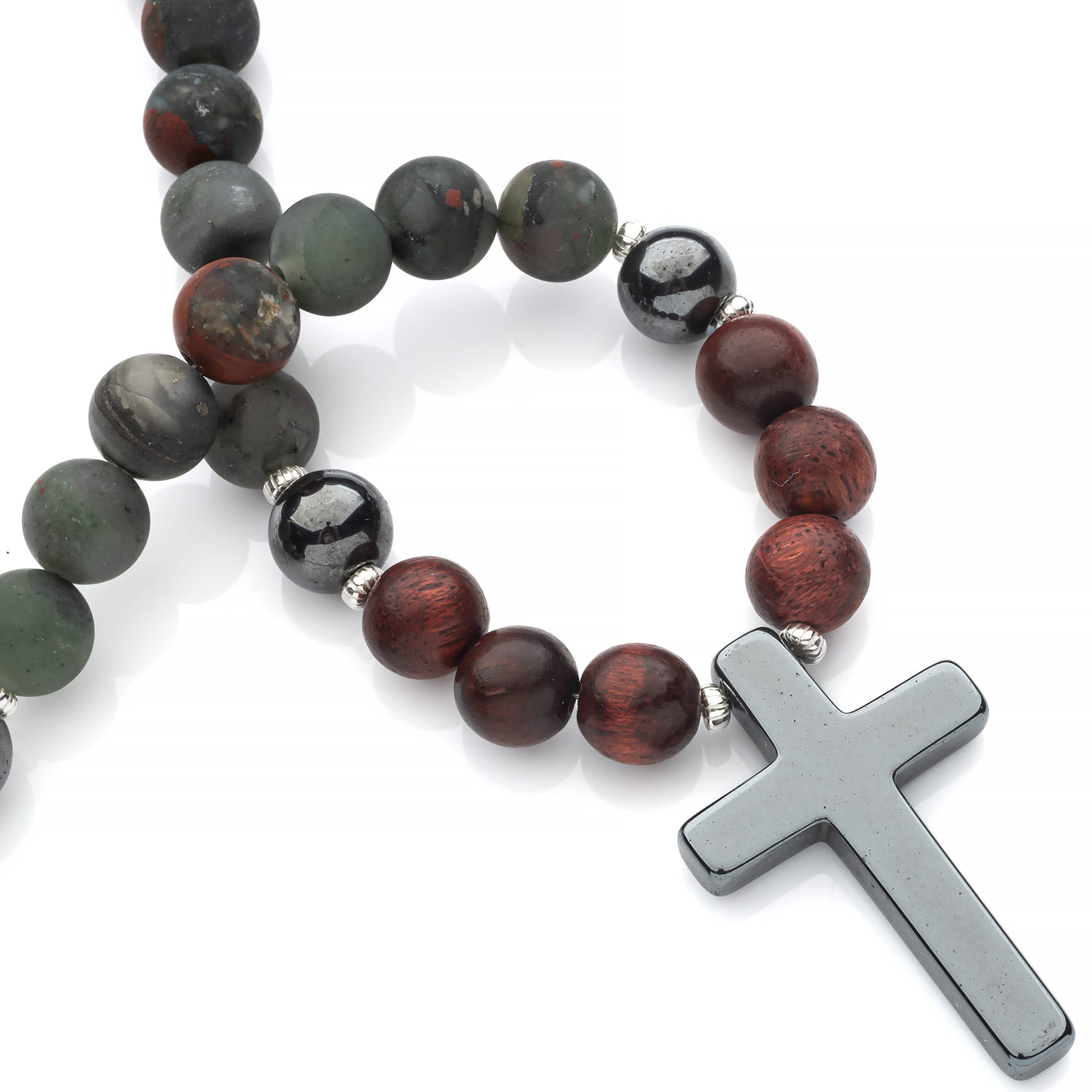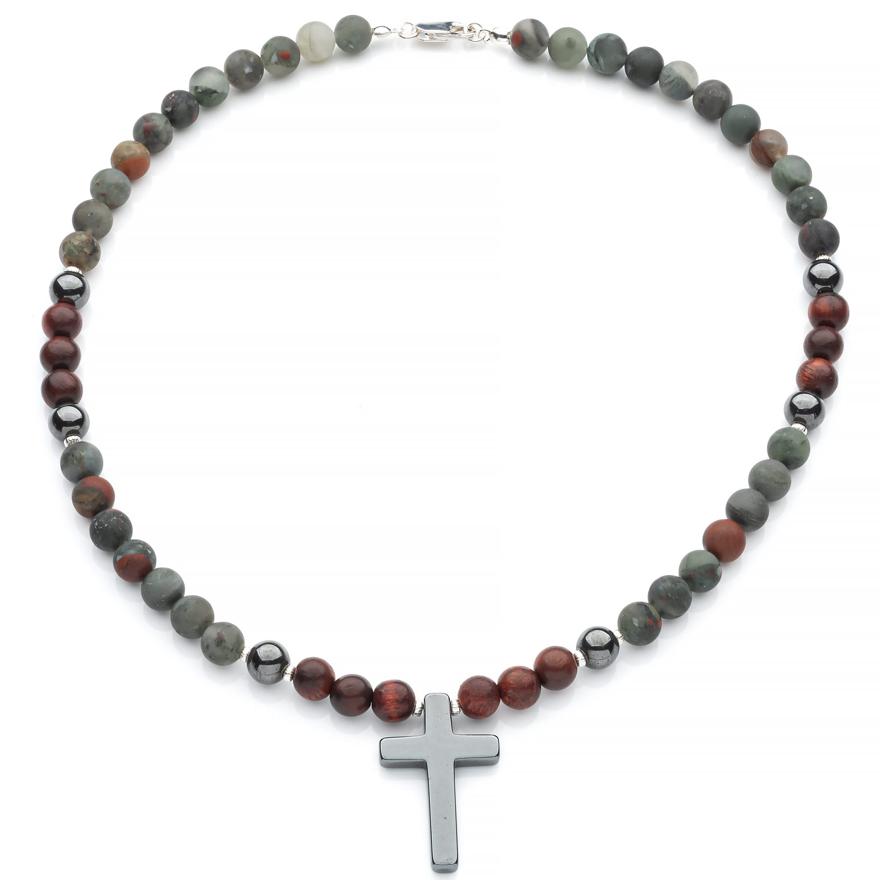 Ręcznie wykonany naszyjnik męski skomponowany z kamienia naturalnego o nazwie Heliotrop, lśniącego hematytu oraz drewna egzotycznego Mahoniu i ozdobnych elementów w postaci nacinanych oponek, wykonanych ze srebra pierwszej próby 925. Heliotrop jest rzadką odmianą chalcedonu o nieregularnym, ciemnym, szaro-zielonym zabarwieniu, w którym występują liczne czerwone oraz pomarańczowe wrostki i plamy. Charakterystyczną cechą tego kamienia jest pojawienie się świetlnych błysków, które powodują wrażenie zmiany barwy minerału po zanurzeniu go w wodzie. Mahoń kojarzy się głównie z elegancją i klasą, jest gatunkiem drewna szlachetnego i posiada nieoczywisty ciemno-brązowo-czerwony kolor. Hematyt, z którego został zrobiony krzyż i kilka paciorków zdobiących naszyjnik - w naturze przybiera kolor czarny i bardzo ciemno-brunatny. Po sproszkowaniu okazuje się być jednak krwisto czerwony. Z tego powodu również w Polsce kamień ten nazywany jest „krwawnikiem”. Paciorki o średnicy 8 mm, które po wypolerowaniu nabrały metalicznego blasku z tęczowymi poświatami, dla ludzkiego oka zdają się być w kolorze grafitowym. W rzeczywistości są jednak czarne. Produkt został zaprojektowany i wykonany ręcznie w Polsce. Opakowanie widoczne na zdjęciu wliczone jest w cenę.