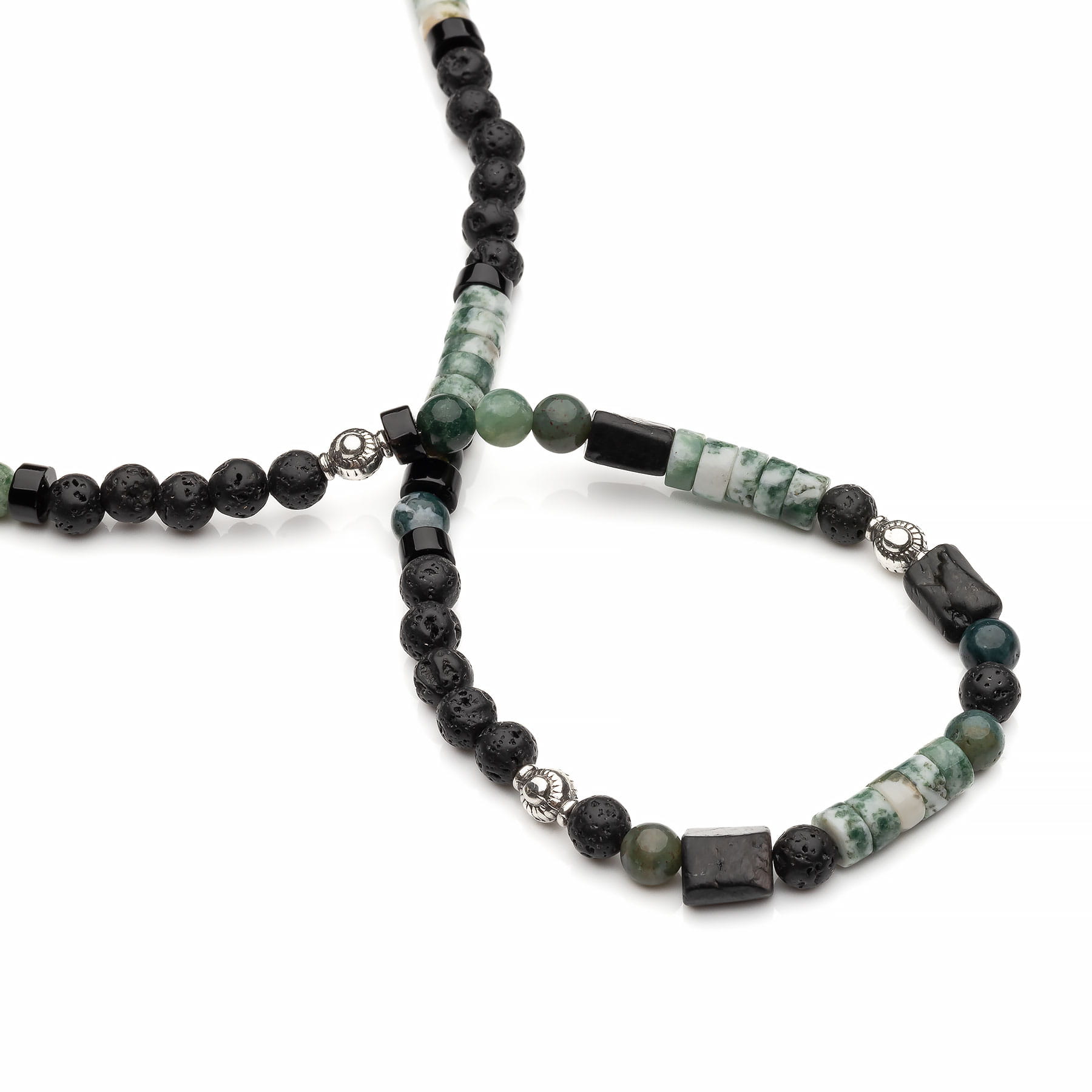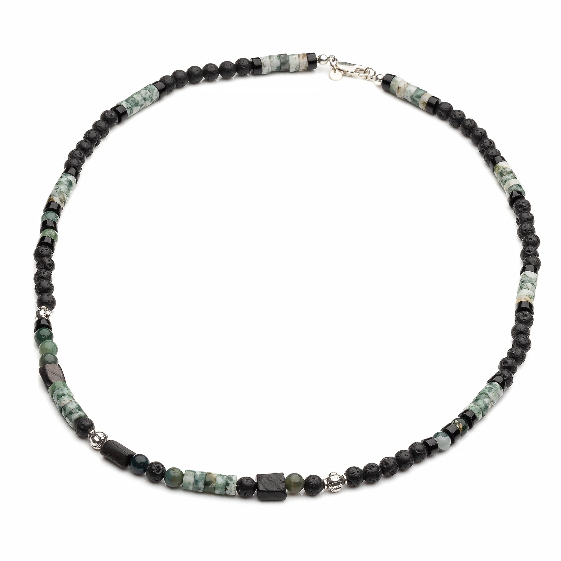 Ręcznie wykonany naszyjnik męski, skomponowany z naturalnych, okrągłych kamieni lawy wulkanicznej o średnicy 6mm, agatu mszystego w formie tzw. "plastrów" o wymiarach 6x5mm oraz kulek 6mm a także szlachetnego heliotropu w postaci walca i czarnych, błyszczących plastrów onyksu. Lawa o nieregularnej strukturze, w kolorze głębokiej, matowej czerni posiada liczne wrostki oraz ubytki co jest jej charakterystyczną cechą, ukształtowaną przez naturę. Agat mszysty występuje w barwach bieli, zieleni, brązu i szarości. Paciorki są półprzezroczyste i dają efekt zatopienia mchu we wnętrzu każdego z nich, stąd nazwa kamienia i dlatego też każdy wzór z niego wykonany będzie unikatowy i niepowtarzalny. Walce szlachetnego heliotropu na pierwszy rzut oka są czarne, ale w słońcu uwidaczniają się przepiękne złoto-karmelowe smugi, które tworzą metaliczną, benzynową powłokę. Nadaje to wyjątkowego, trójwymiarowego efektu i głębi. Całość uzupełniona plasterkami z czarnej warstwy błyszczącego onyksu oraz srebrem pierwszej próby 925 a także srebrem oksydowanym. Nietuzinkowy, męski wzór naszyjnika podkreślający charakter. Produkt został zaprojektowany i wykonany ręcznie w Polsce. Opakowanie widoczne na zdjęciu wliczone jest w cenę.