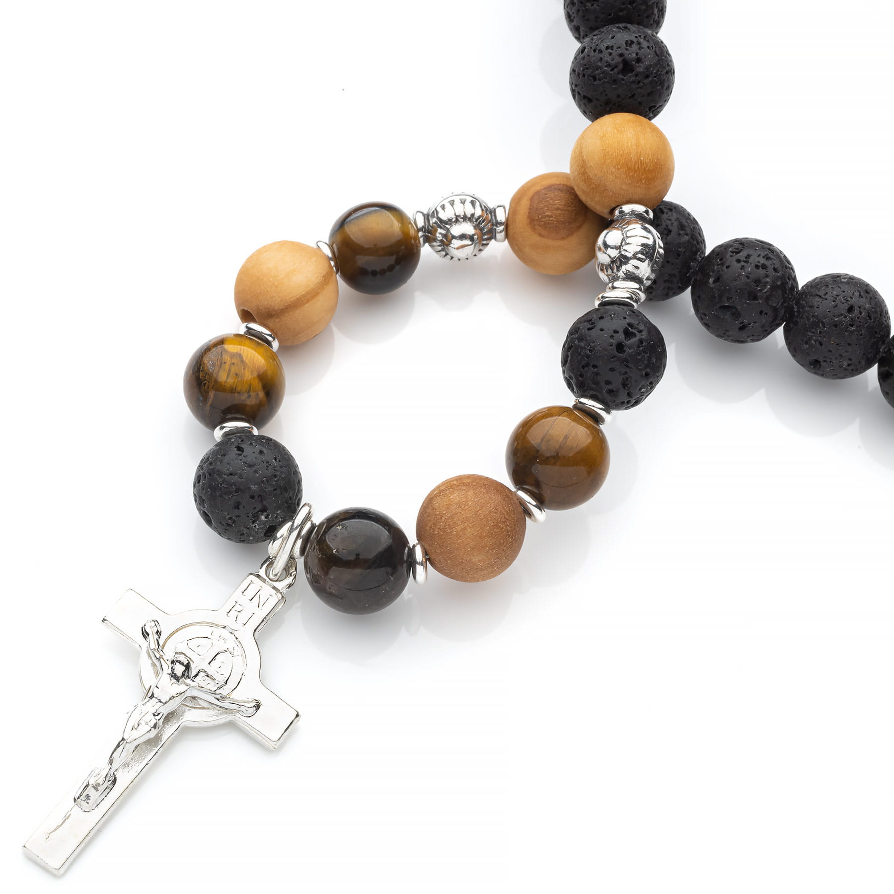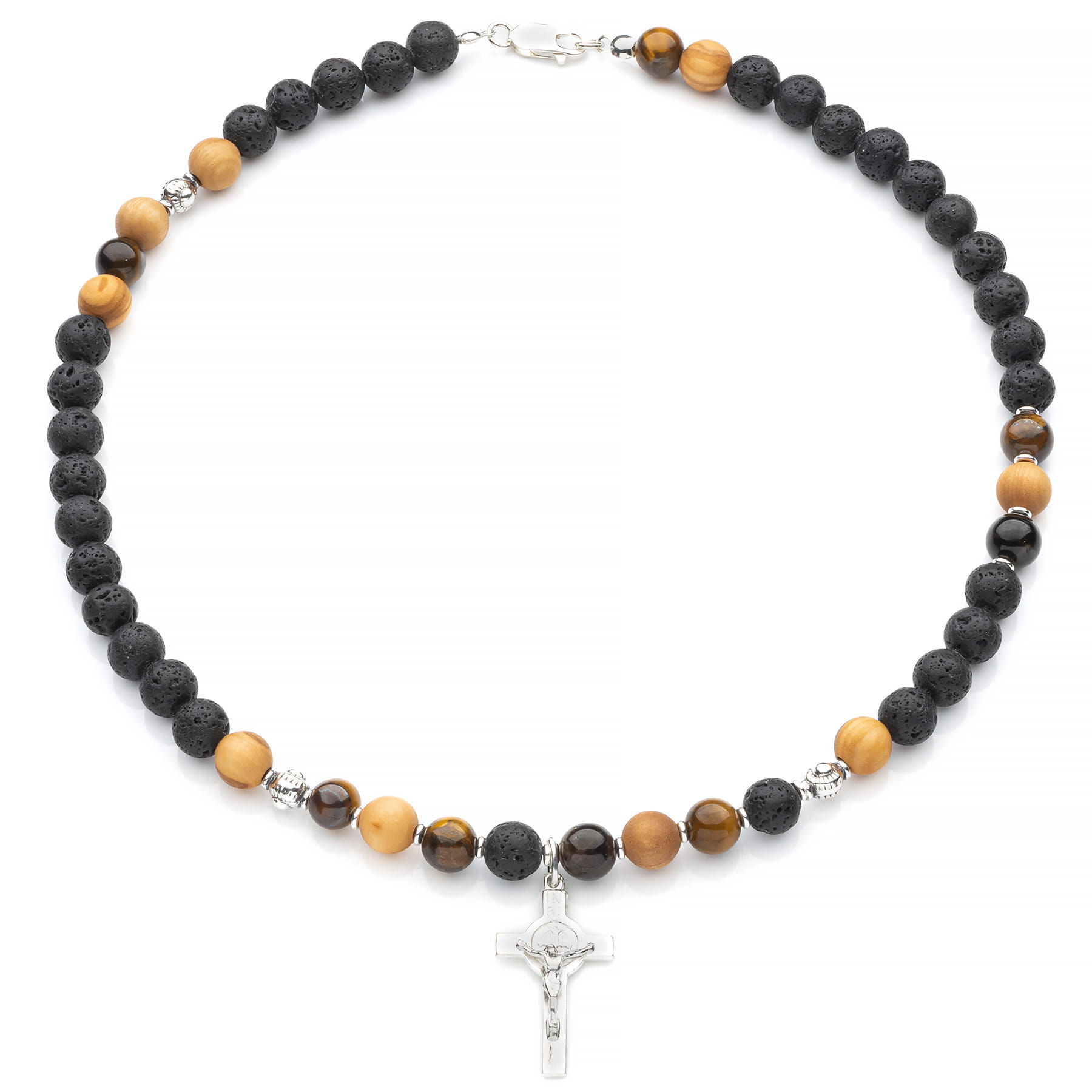 Naszyjnik z kamieni naturalnych i drewna egzotycznego ze srebrnym krzyżem św. Benedykta