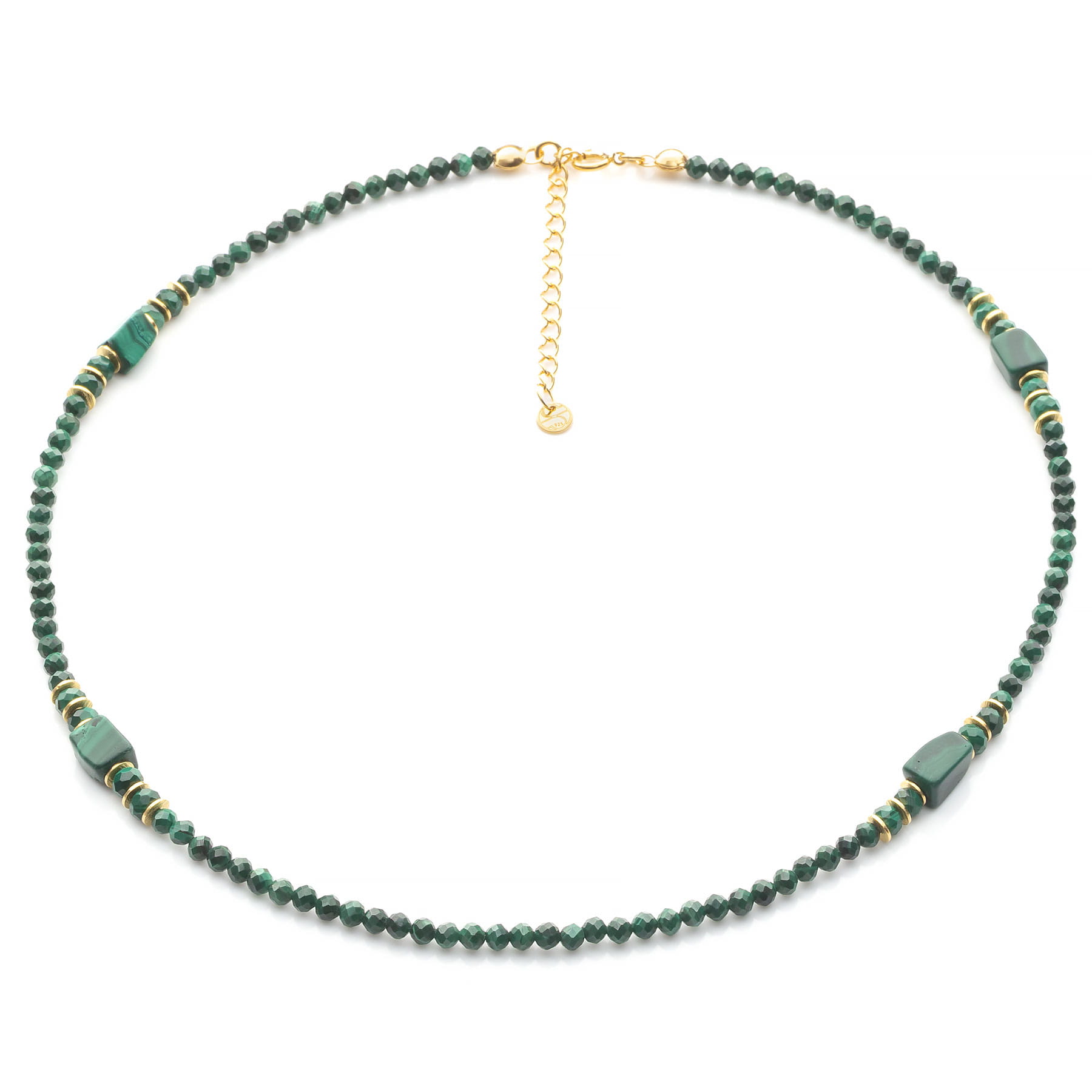 Krótki naszyjnik damski typu choker (40cm), stworzony w całości z błyszczącego, szlachetnego, nietransparentnego malachitu o średnicy głównie 4mm. Kolor łączy w sobie przebarwienia o różnym nasyceniu, od jasnej do ciemnozielonej, niemal czarnej barwy. Naturalny malachit łatwo rozpoznać po tym, że nie posiada jednolitej struktury ani równo rozmieszczonych, wyraźnych pasów w czarnym kolorze. Przejścia barwy są rozmyte i nieregularne a każdy kamień wyraźnie się różni. W naszyjnik wkomponowano malachit w formie walca i fasetowanych oponek a także drobne przekładki wykonane ze srebra pierwszej próby 925, pozłacanego 24k złotem (ciemno żółte). Produkt został wykonany ręcznie w Polsce. Opakowanie widoczne na zdjęciu wliczone jest w cenę.