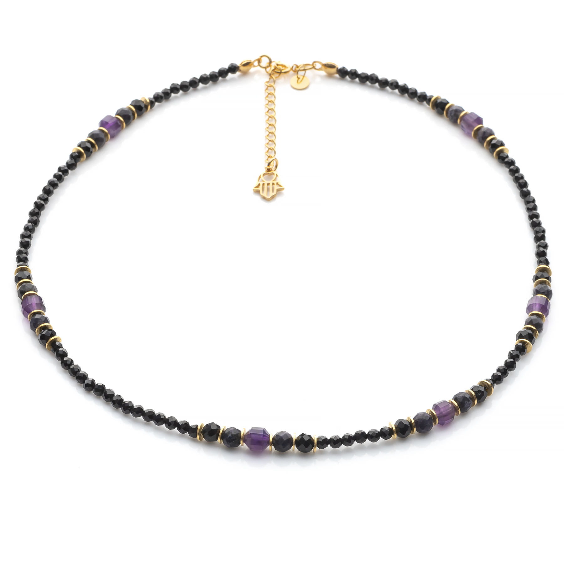 Krótki naszyjnik typu choker (40cm) wykonany z błyszczących, czarnych turmalinów klasy AAA oraz fasetowanego czaroitu i ametystu w formie tzw. "beczki". Elementy ozdobne, drobna zawieszka z ręką Fatimy oraz wykończenie zrobione ze srebra 925, pozłacanego 24 karatowym złotem (ciemno-żółte).Turmaliny są rzadkimi kamieniami szlachetnymi o różnorodnych barwach i właściwościach. W obecnym wzorze wykorzystano fasetowane, szlachetne turmaliny o średnicy 3mm i 4mm w odcieniu głębokiej, błyszczącej czerni. Podczas klasyfikacji turmalinów ocenia się ich kolor, połysk, czystość oraz szlif, klasa AAA oznacza najwyższą ocenę w każdej z wymienionych kategorii. Ametyst jest kamieniem półszlachetnym, zwykle przybiera kolor fioletowy o różnych stopniach nasycenia i uznaje się go za jedną z najpiękniejszych odmian kwarcu. Czaroit jest znany dopiero od około 50 lat, wyglądem przypomina mieszankę lapisu lazuli i ametystu. Bardzo urokliwy, ciekawy i niejednorodny kamień, a ze względu na ograniczone występowanie także dość ekskluzywny. Na końcu przedłużki drobna zawieszka w postaci ręki Fatimy z serduszkiem. Produkt wykonany ręcznie w Polsce. Opakowanie widoczne na zdjęciu wliczone jest w cenę.