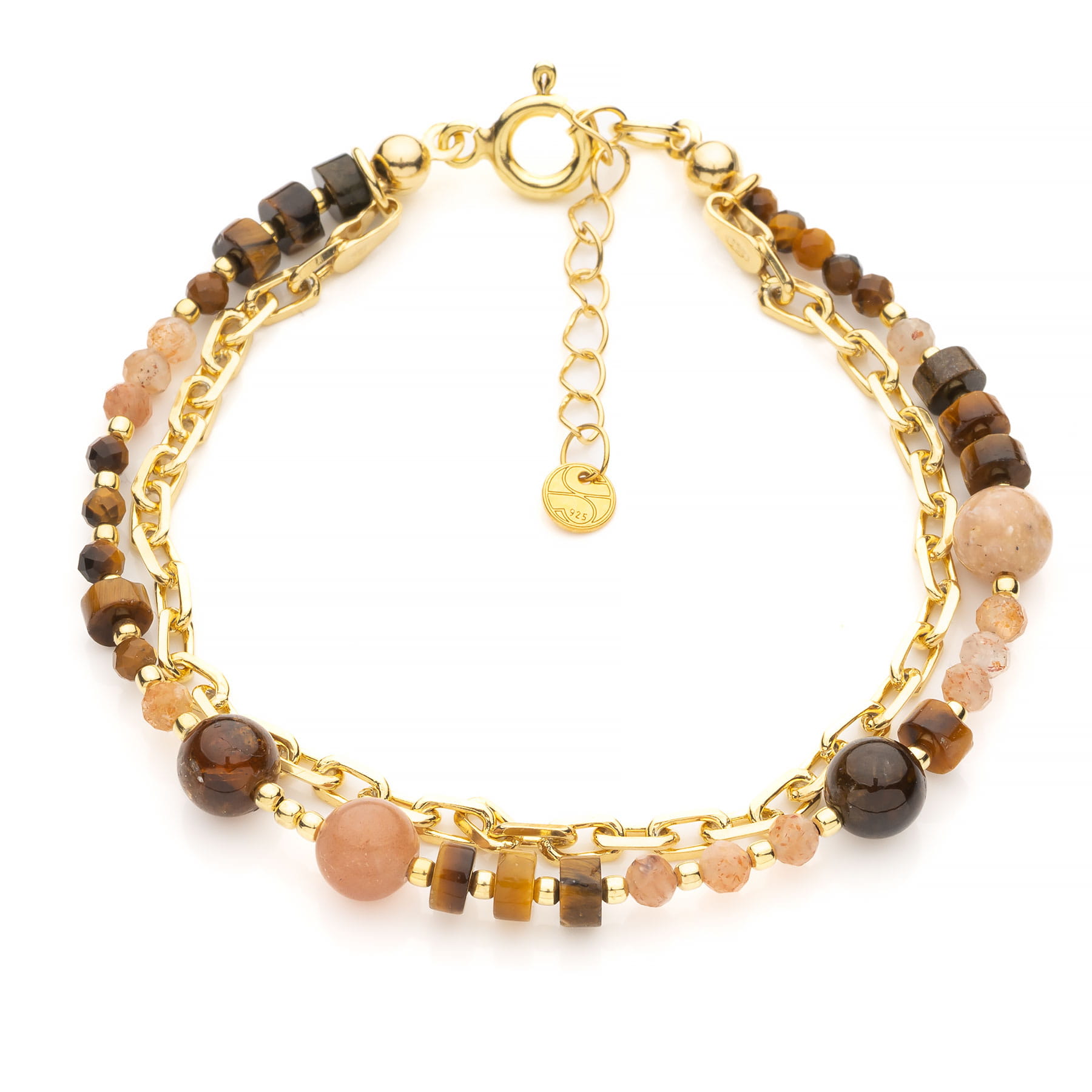 Podwójna bransoletka, wykonana z naturalnych kamieni tygrysiego oka, mieniących się barwami złota, karmelu i różnych odcieni brązu. W obecnym modelu wykorzystano okrągłe kamienie o średnicy 3mm oraz tzw."plasterki" 4x3mm. Kamień zawdzięcza swoją nazwę niezwykłemu efektowi optycznemu – w blasku słońca połyskujące, jasne pasmo przemieszcza się niczym na sierści dzikiego kota. W odcieniu pudrowego różu występuje tu błyszczący tysiącami drobinek kamień słoneczny klasy AAA o średnicy 4mm i 6mm oraz opal peruwiański 6mm. Uzupełnienie bransoletki stanowią turmaliny 6mm w kolorze koniakowym oraz srebro próby 925, pozłacane 18-k złotem (jasno żółte), w postaci łańcuszka typu ankier, przekładek ozdobnych i elementów wykończenia. Łańcuszek zamontowany jest na stałe, dzięki czemu bransoletki lepiej się układają i prezentują, niż w przypadku noszenia dwóch pojedynczych. Biżuteria wykonana ręcznie w Polsce. Opakowanie widoczne na zdjęciu wliczone jest w cenę.