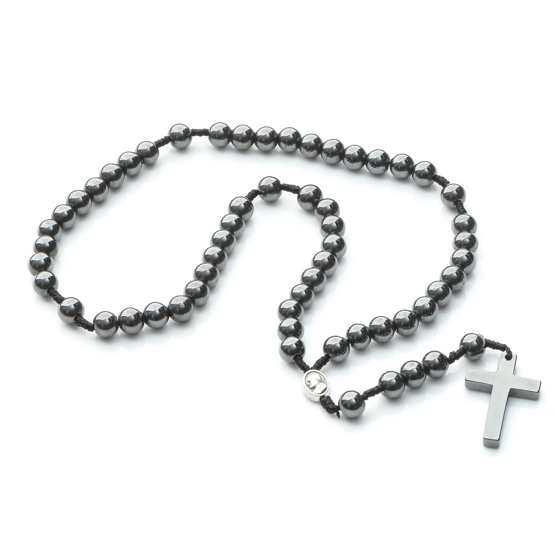 Różaniec wykonany z Hematytu, który w naturze przybiera kolor czarny i bardzo ciemno-brunatny, jednak po sproszkowaniu okazuje się być krwisto czerwony. Z tego powodu również w Polsce kamień ten nazywany jest „krwawnikiem”. Paciorki o średnicy 8 mm, które po wypolerowaniu nabrały metalicznego blasku z tęczowymi poświatami, dla ludzkiego oka zdają się być w kolorze grafitowym. W rzeczywistości są jednak czarne. Metalowy łącznik J.P II, krzyż hematytowy. Dość ciężki, męski różaniec długości 52 cm do łącznika. Stanowi praktyczny a zarazem nietuzinkowy upominek religijny nie tylko dla mężczyzny. Produkt wykonany ręcznie w Polsce. Opakowanie widoczne na zdjęciu wliczone jest w cenę.