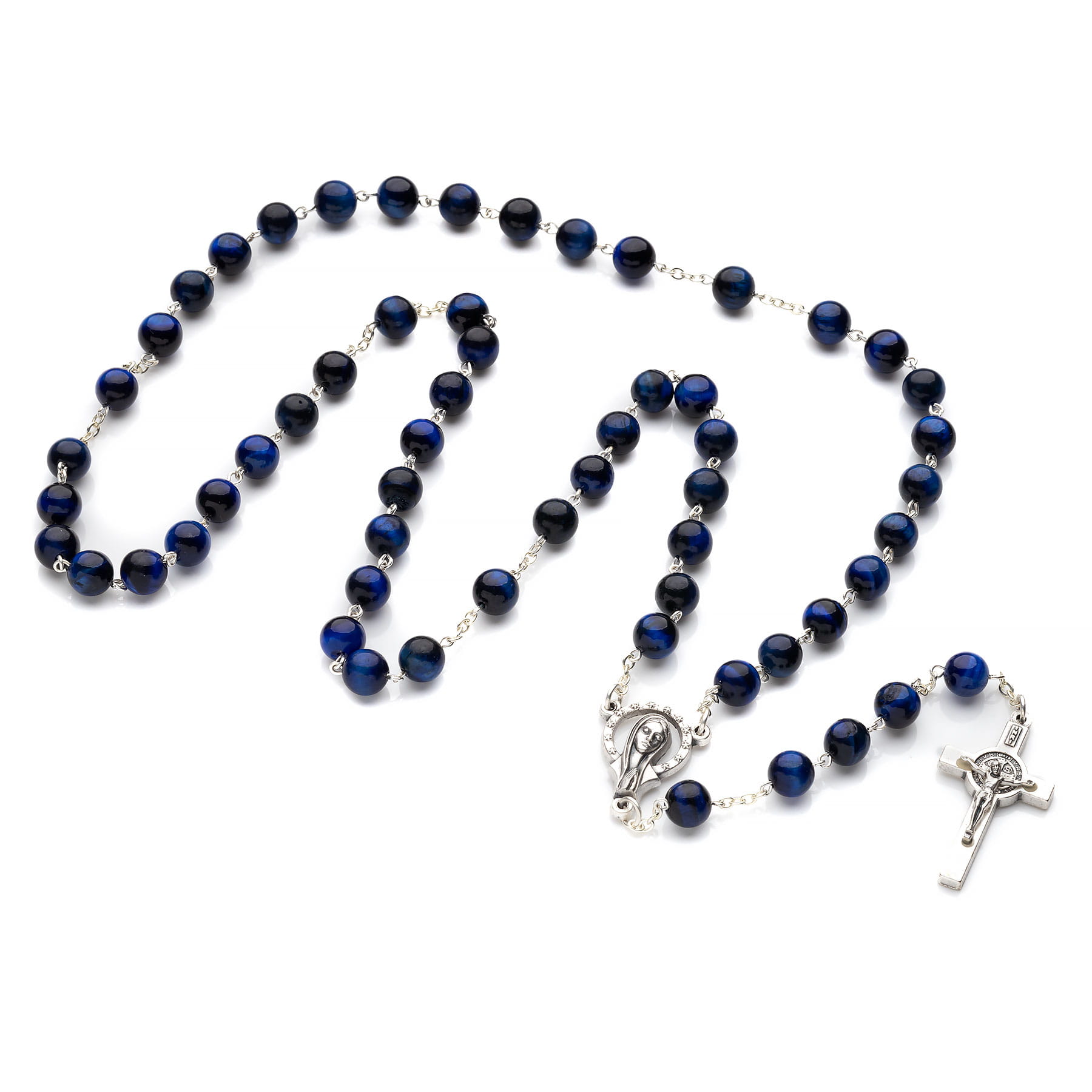 Ręcznie wykonany, elegancki różaniec z kamieni półszlachetnego tygrysiego oka niebieskiego. Naturalne tygrysie oko można łatwo rozpoznać po połyskujących pasmach, przypominających te na sierści dzikiego kota. Kamień w wersji podstawowej występuje w kolorze złota, karmelu i różnych odcieni brązu, ale w tej wyjątkowo rzadkiej odsłonie jest kamieniem półszlachetnym w kolorze niebieskim. Zawdzięcza swoją nazwę niezwykłemu efektowi optycznemu – w blasku słońca tygrysie oko lśni i migocze, a połyskujące jasne pasmo przemieszcza się podczas poruszania kamieniem. W obecnym modelu użyto paciorków o średnicy 8mm w intensywnym odcieniu, łączącym w sobie kolory błękitu, granatu, a niekiedy również zieleni. Posiada w swojej strukturze rozmyte wtrącenia o różnym nasyceniu barwy. Obwód różańca do łącznika to około 75 cm (przechodzi przez głowę). Metalowe elementy najwyższej jakości wykonane we Włoszech,- krzyż św. Benedykta, ażurowy łącznik Matka Boża. Różaniec w ciemnym, wyjątkowym kolorze stanowi elegancki i nietuzinkowy upominek religijny dla bliskiej osoby. Produkt wykonany ręcznie w Polsce. Opakowanie widoczne na zdjęciu wliczone jest w cenę.